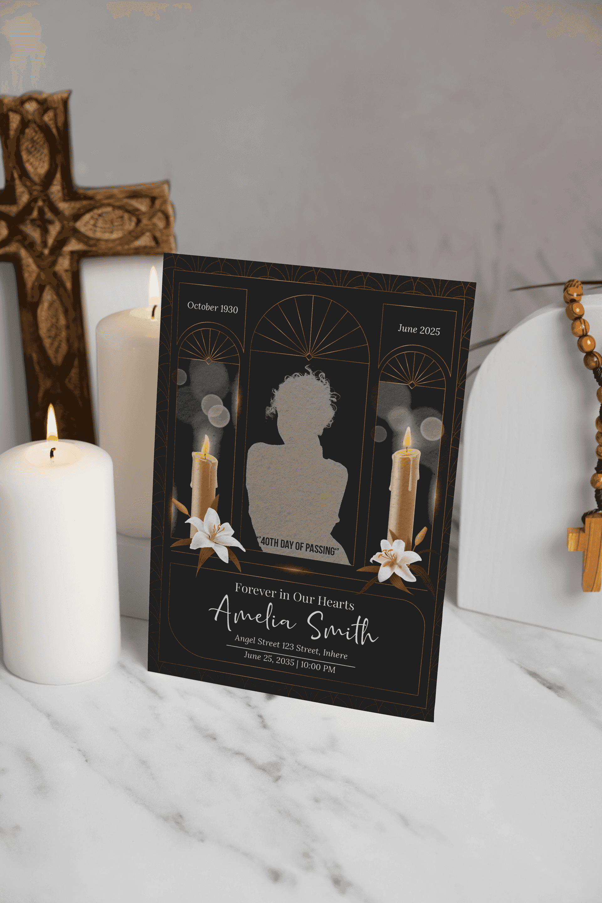 Di bawah foto terdapat nama, tanggal lahir dan wafat, alamat lokasi acara, serta waktu acara. Ilustrasi lilin menyala di bagian bawah memberikan kesan hangat dan penuh doa. Tipografi menggunakan font yang halus dan bersahabat, menambah kesan lembut dan penuh penghormatan terhadap orang yang telah tiada. Elemen salib dan rosario di sekitar mockup juga memperkuat konteks keagamaan dari acara memorial ini.