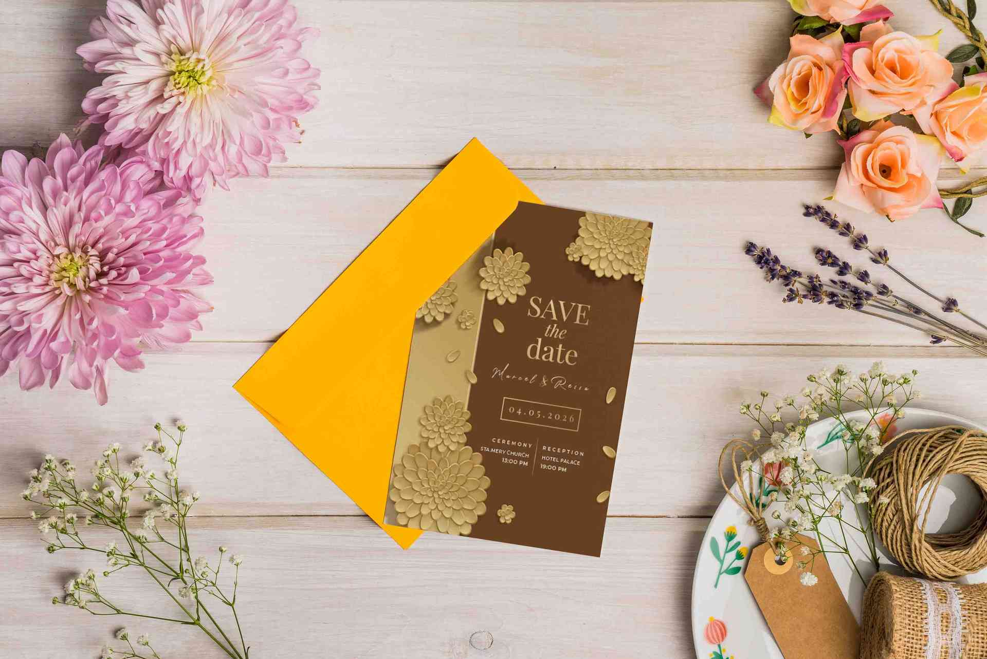 Undangan ini hadir dengan desain mewah berlatarkan kombinasi warna emas dan coklat yang elegan. Hiasan bunga timbul berwarna emas menghiasi sekeliling...