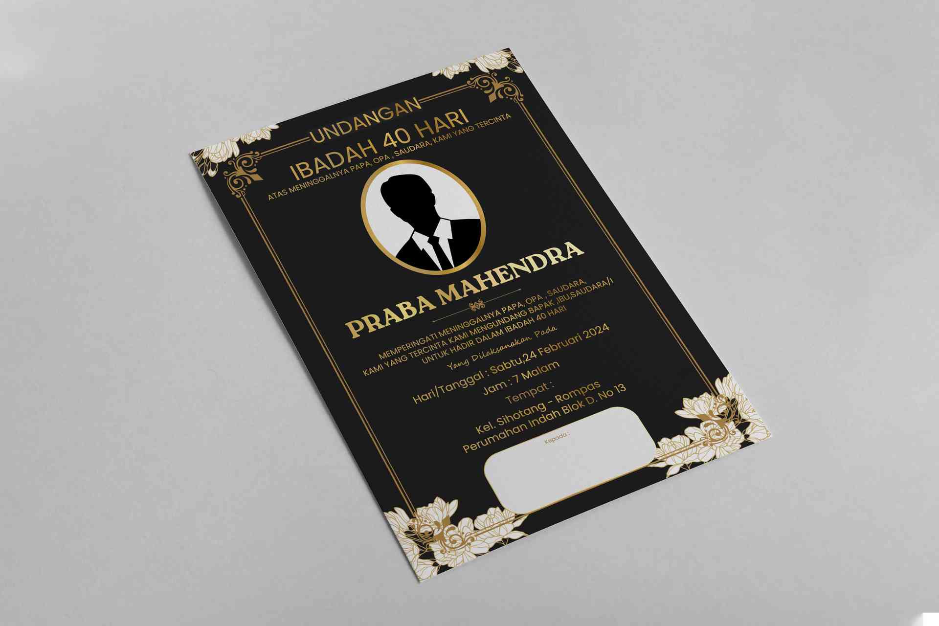 Desain ini adalah undangan peringatan hari ke-40 meninggalnya seseorang. Nuansa warna hitam dan emas mendominasi tampilan desain, memberikan kesan ele...