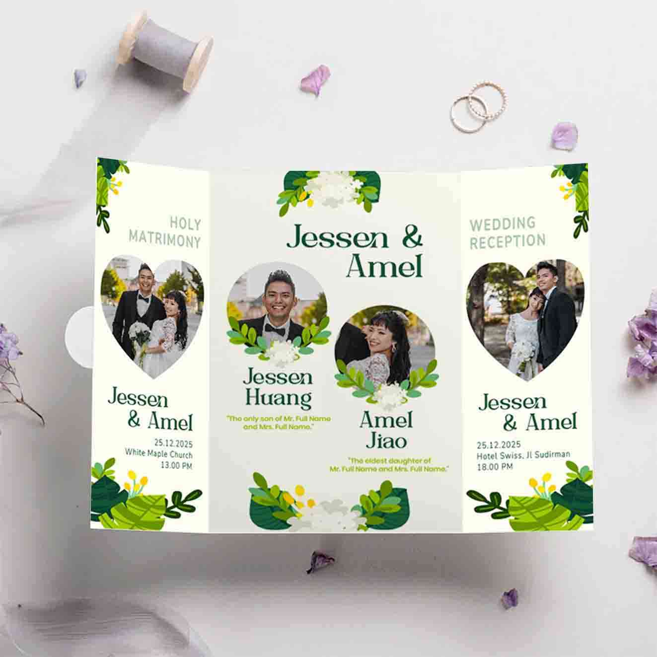 Undangan pernikahan lipat tiga bergaya elegan ini didominasi warna putih dengan aksen hijau dan kuning serta dekorasi ilustrasi bunga di sisi atas dan...