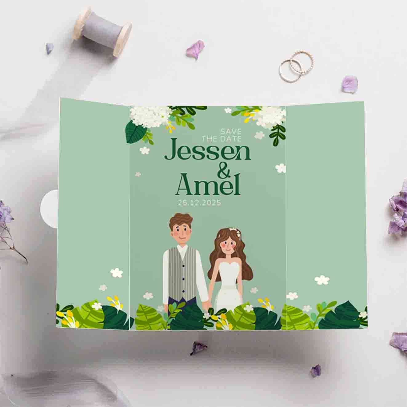Undangan pernikahan bercorak botanical ini menampilkan desain dua sisi dengan motif daun berwarna hijau dan sentuhan emas yang artistik, menghadirkan...