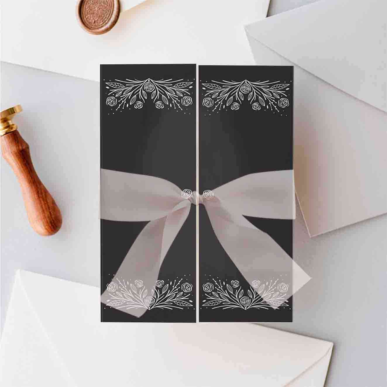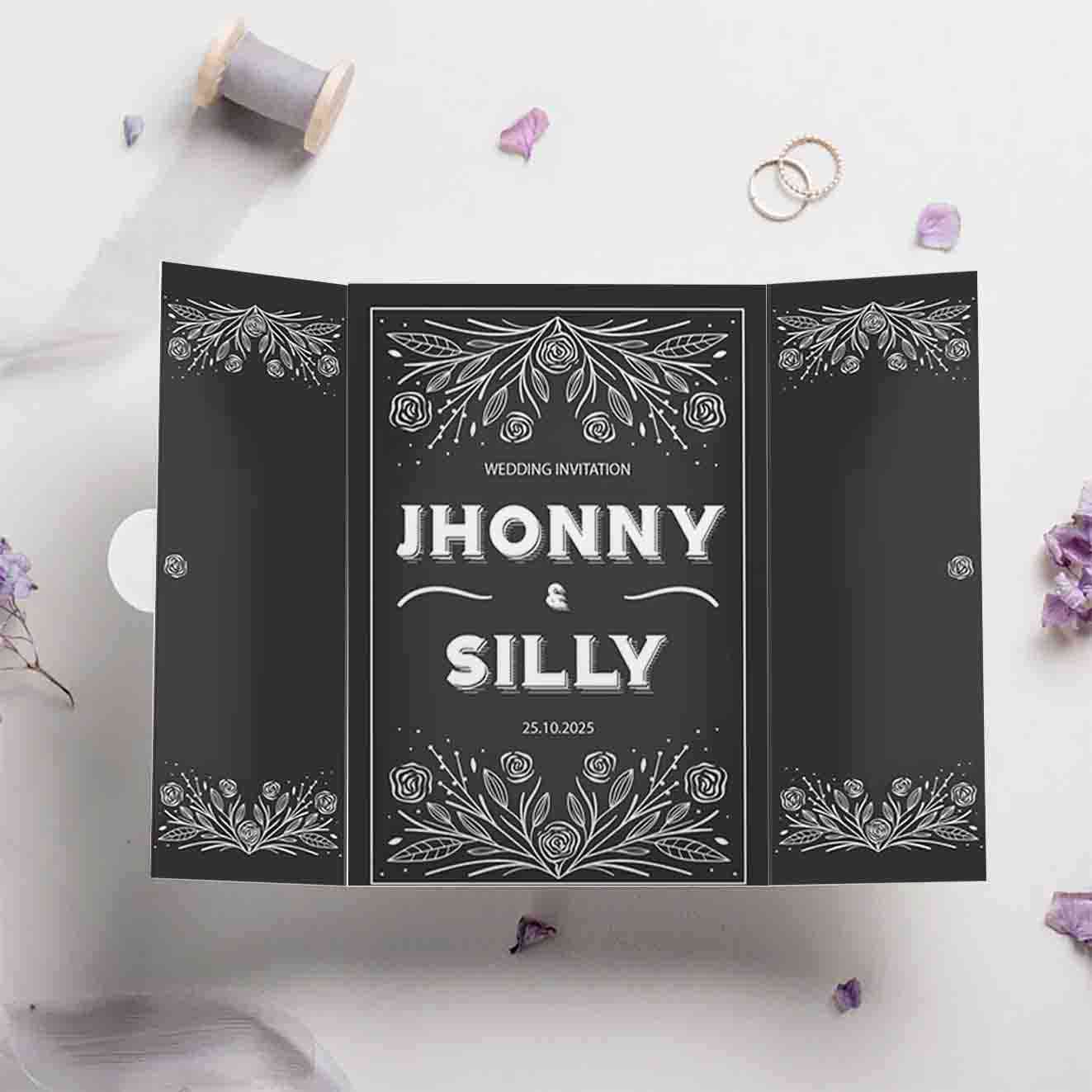 Undangan Pernikahan Lipat Tiga ini menghadirkan nuansa elegan dan berkelas dengan dominasi warna hitam matte yang dipadukan dengan ornamen floral puti...