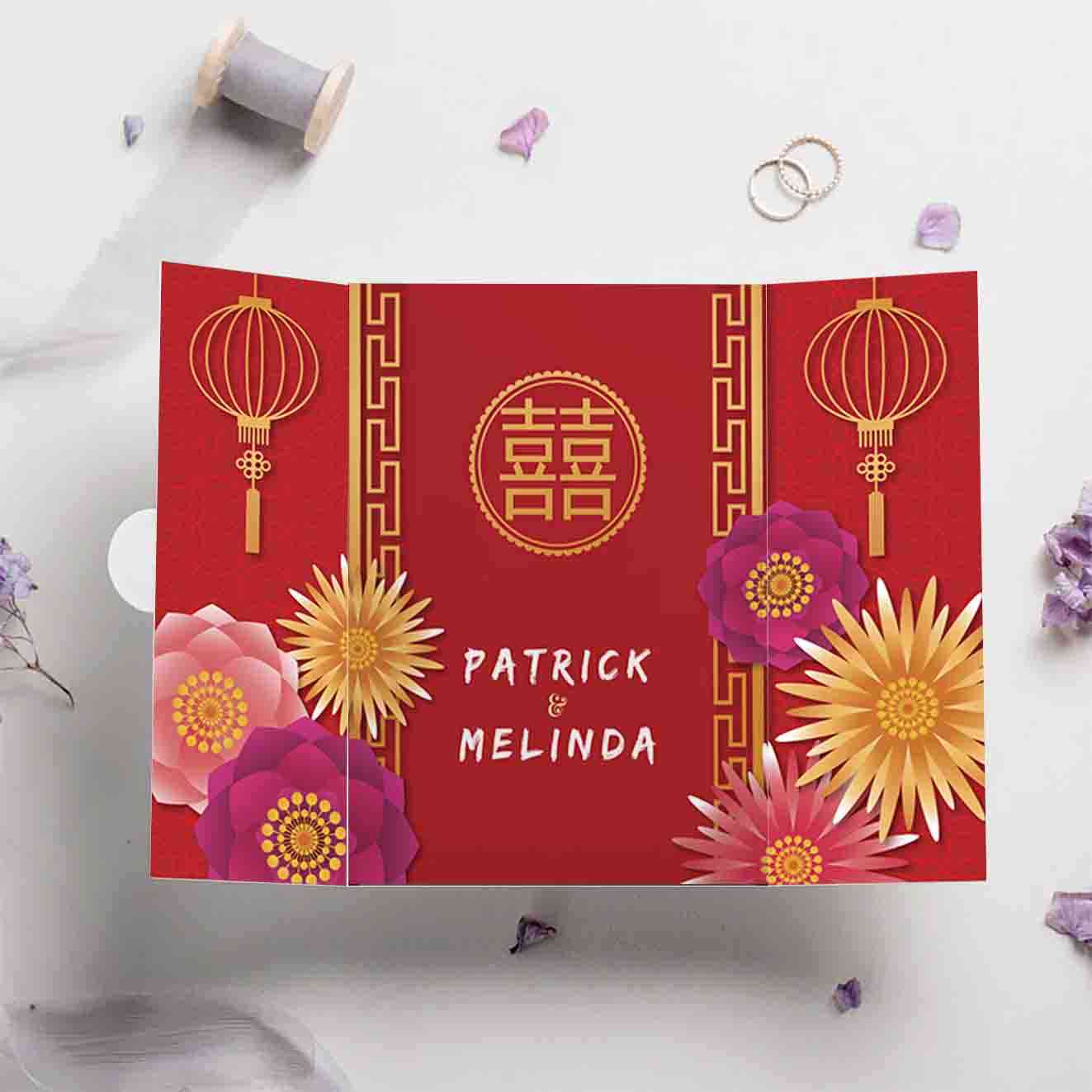 Undangan tunangan ini menghadirkan nuansa Oriental mewah dengan warna merah dan emas yang megah, melambangkan cinta abadi, kemakmuran, dan kebahagiaan. Motif bunga teratai berpadu indah dengan simbol Double Happiness, menciptakan kesan harmonis dan penuh makna budaya Tionghoa. Setiap detailnya dirancang untuk memancarkan keanggunan, keberuntungan, dan kehangatan cinta pasangan yang akan melangkah menuju ikatan suci. Cocok untuk acara engagement atau pernikahan bertema oriental elegan.