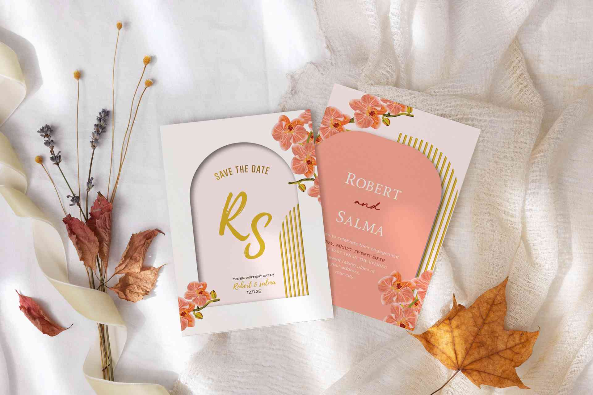 Desain undangan ini menampilkan konsep elegan dan modern dengan nuansa warna peach lembut dan putih yang dipadukan dengan elemen bunga orkid berwarna...