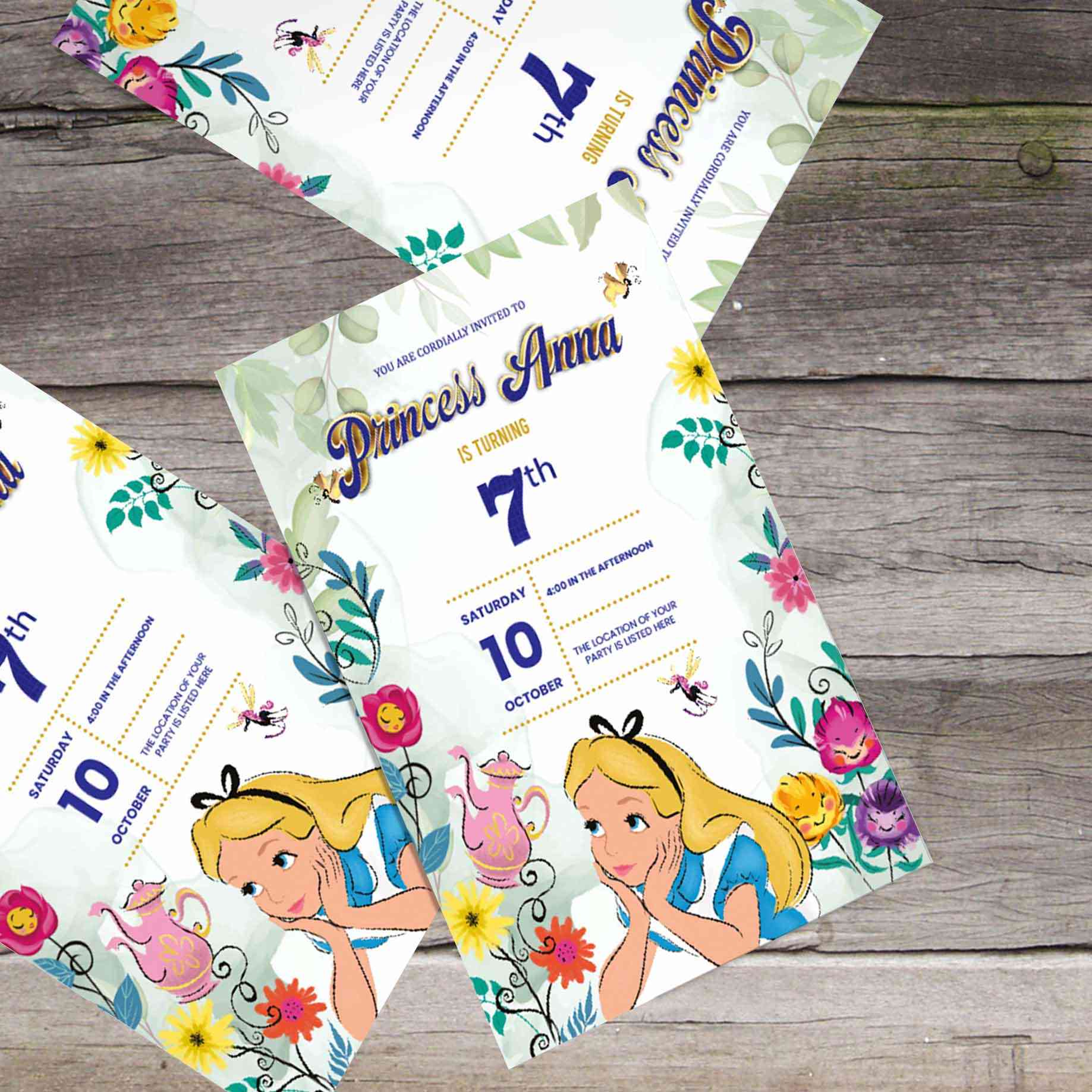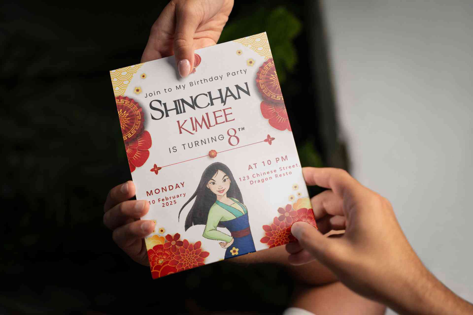 Desain undangan ini sangat cocok untuk ulang tahun anak perempuan bertema princess, royal ball. Kombinasi warna emas, ilustrasi klasik, dan dekorasi bunga mawar menjadikannya undangan yang mewah, elegan, dan penuh keajaiban dongeng.
