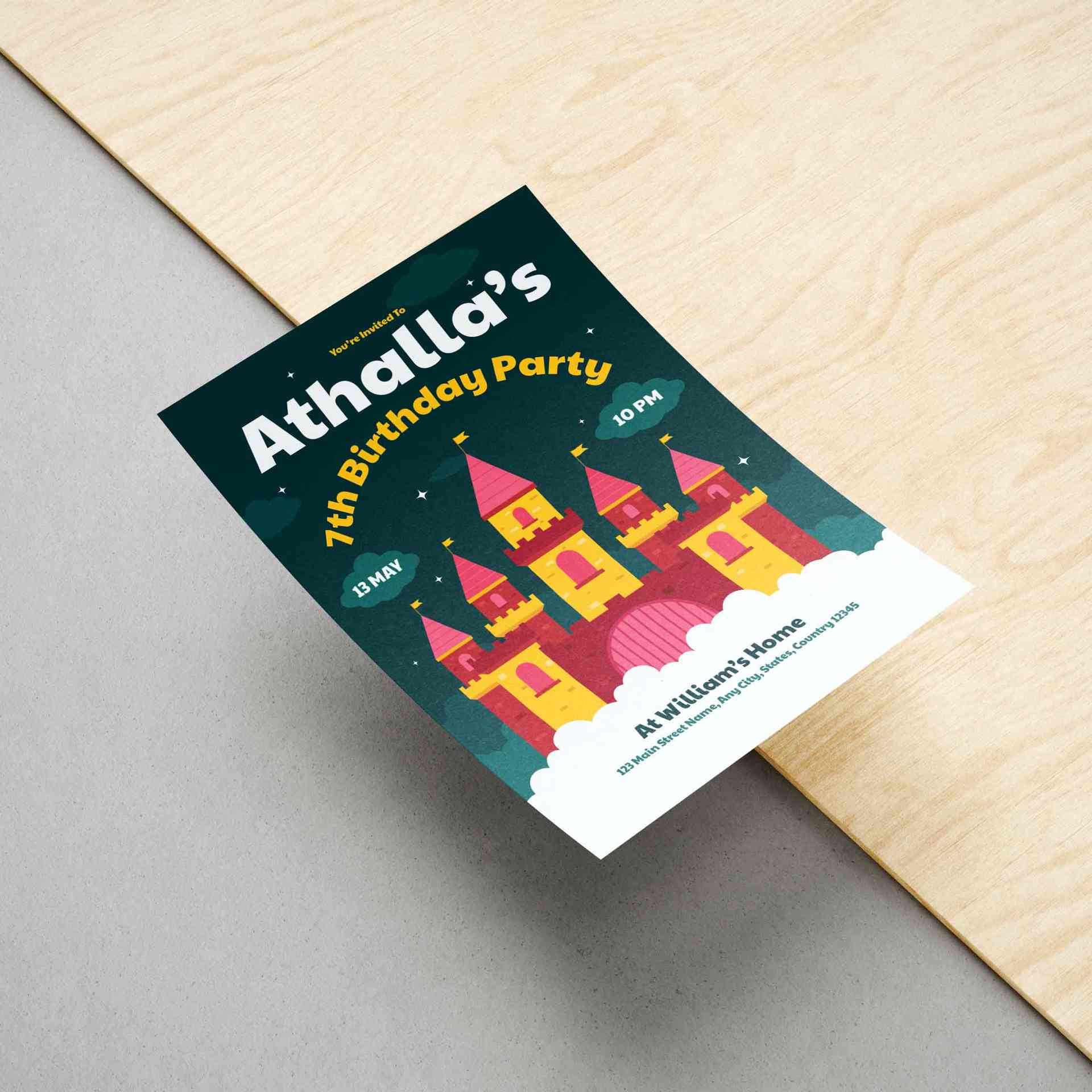 Undangan ulang tahun anak bertema kastil berbentuk persegi panjang dengan dominasi warna gelap pada latar dan warna cerah seperti merah muda, kuning,...