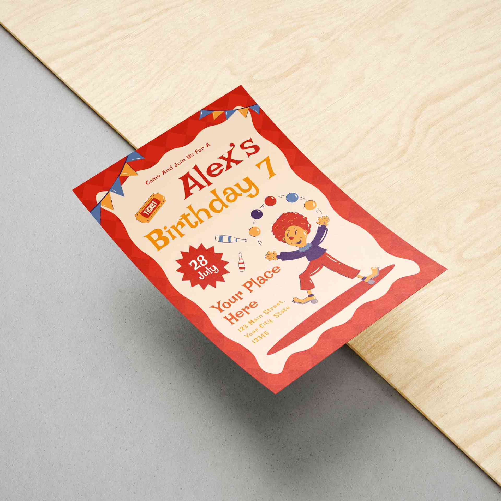 Undangan ulang tahun anak dengan tema orange dan karakter badut ini memiliki bentuk persegi panjang, warna dominan oranye dan krem, serta dihiasi ilus...