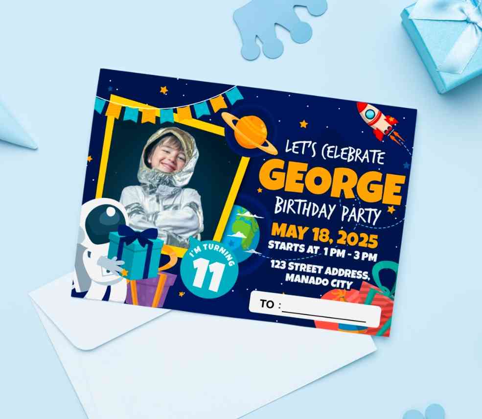 Undangan ulang tahun ini mengusung tema luar angkasa yang seru dan penuh imajinasi, sangat cocok untuk anak-anak yang menyukai dunia antariksa. Dengan...