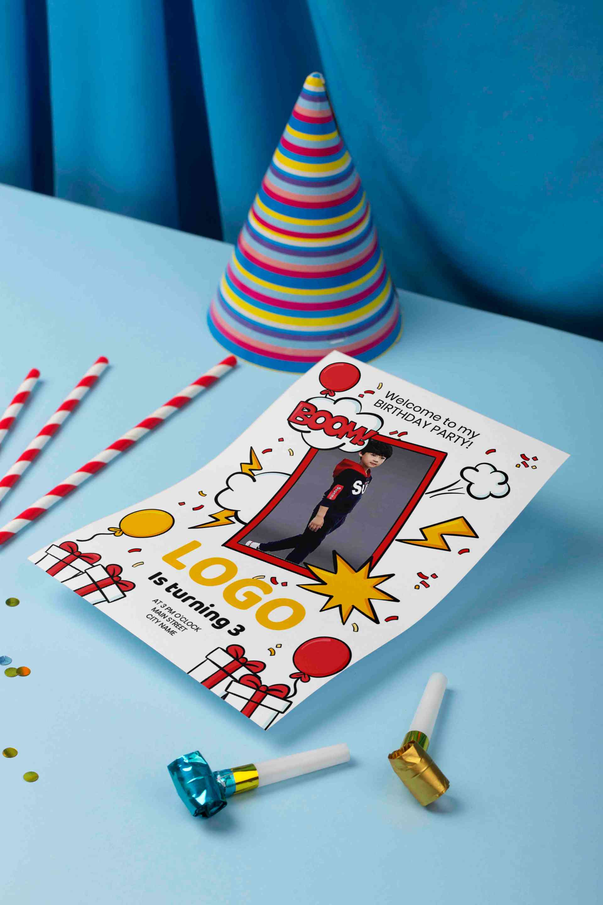 Desain undangan ulang tahun ini menampilkan tema komik superhero yang ceria dan playful, dengan background putih dihiasi ilustrasi balon, kado, petir,...