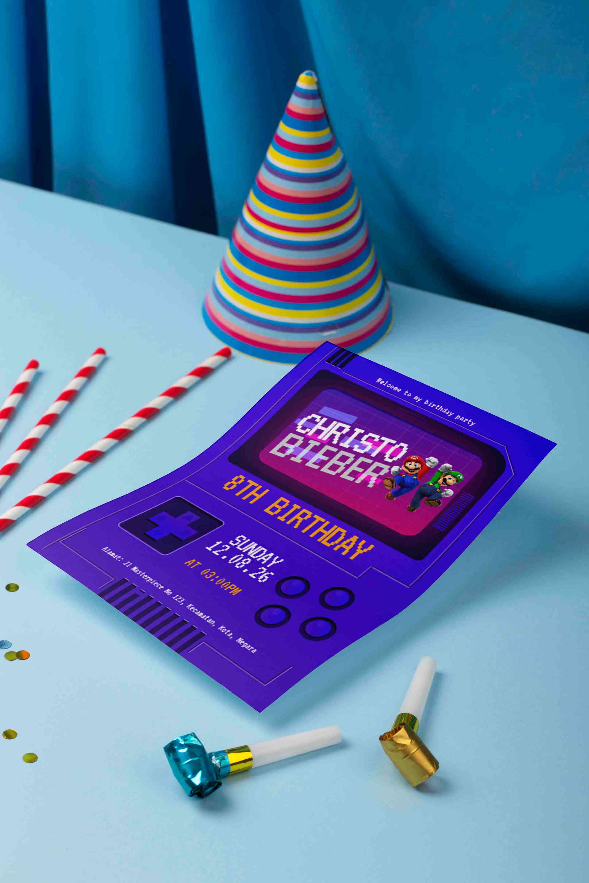 Desain undangan ulang tahun ini menghadirkan tema game console retro yang keren dan unik dengan dominasi warna ungu dan biru elektrik. Bagian atas men...