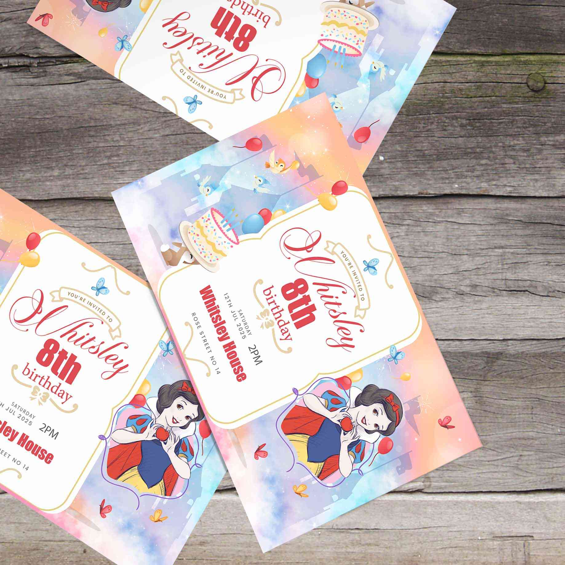 Undangan ulang tahun bertema Snow White ini menghadirkan desain yang ceria dan penuh warna dengan sentuhan keajaiban dongeng. Latar belakang undangan...