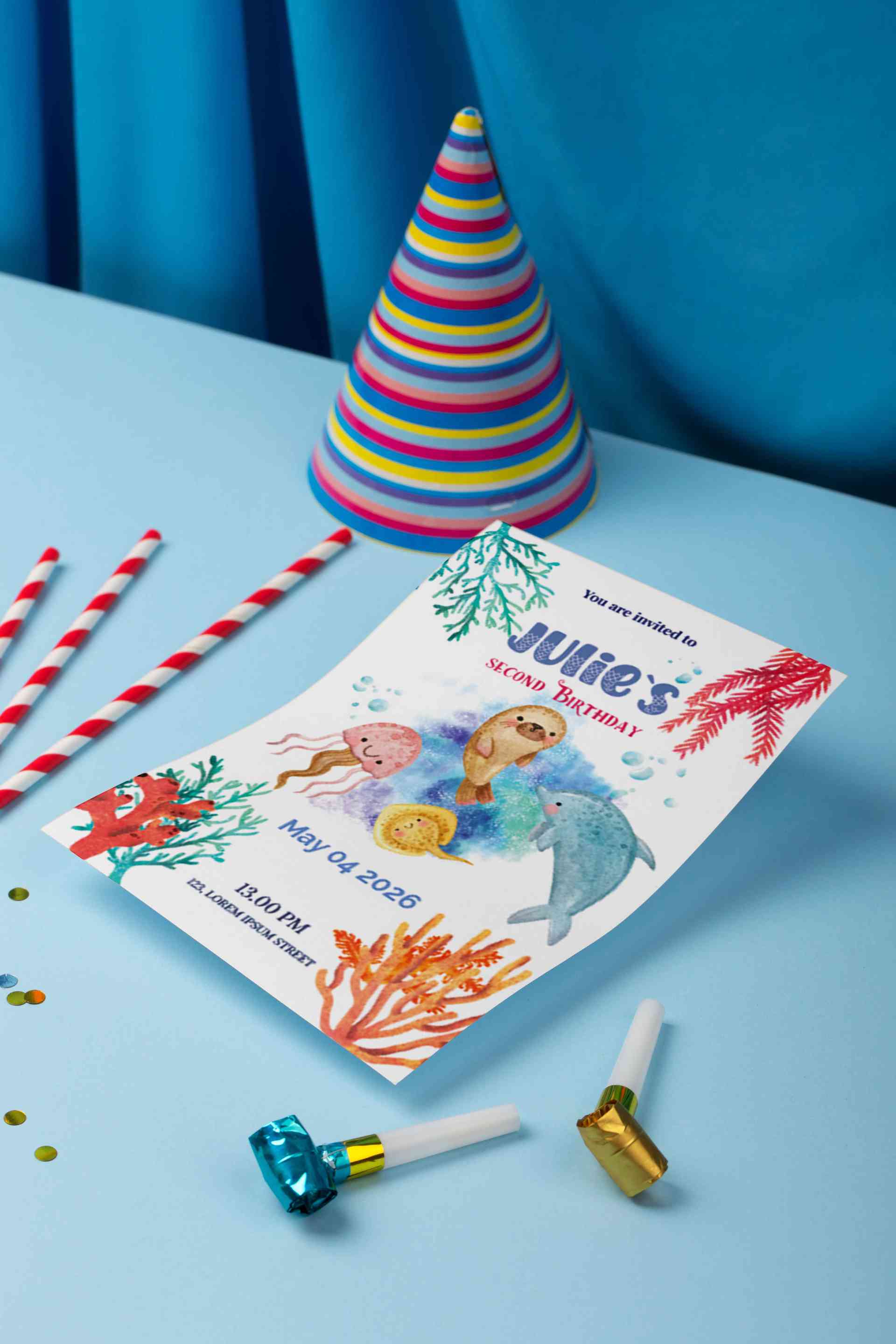 Desain undangan ini menampilkan tema laut yang sangat cocok untuk ulang tahun anak usia dini. Dengan gaya ilustrasi watercolor yang lembut dan penuh w...