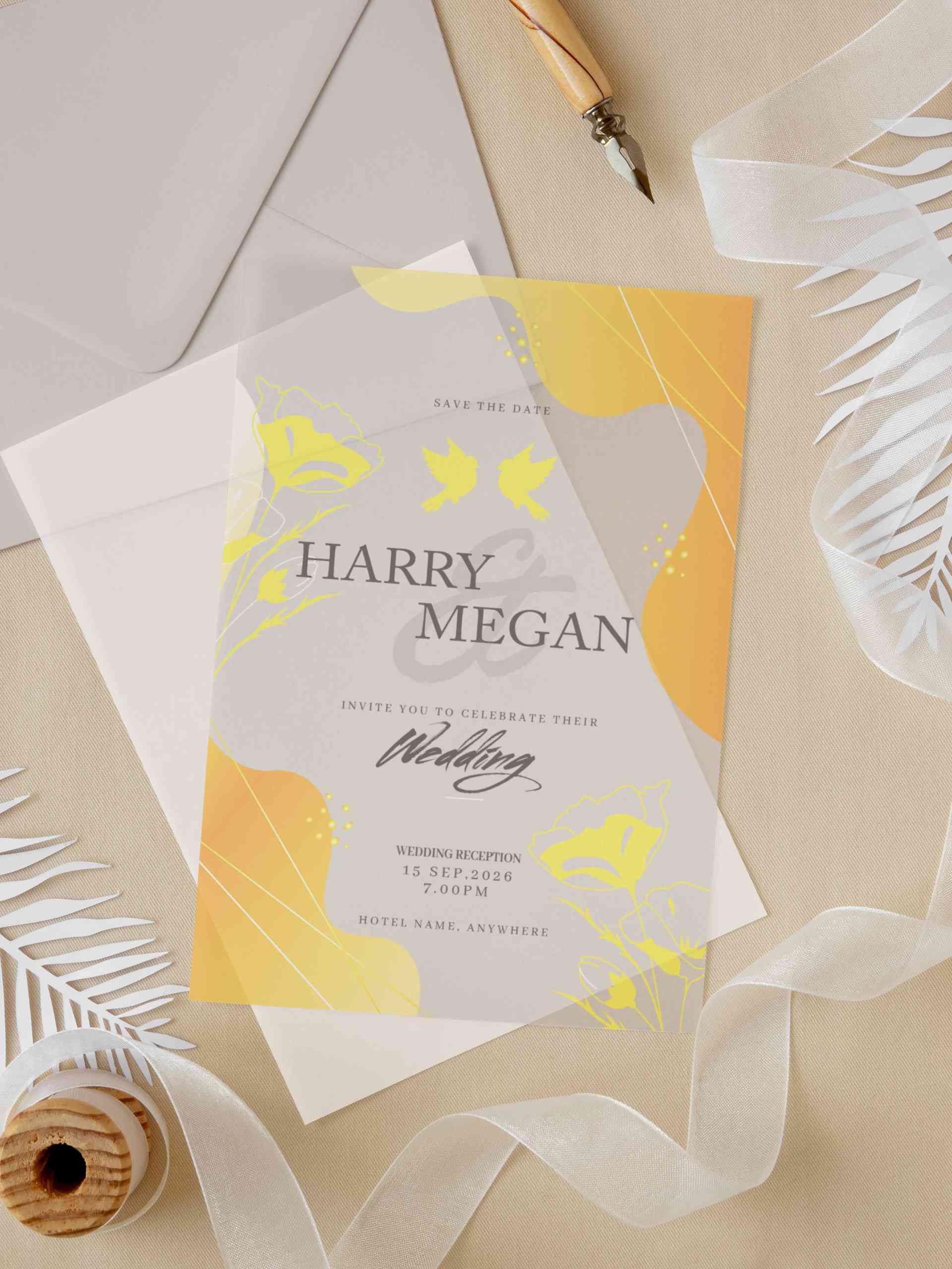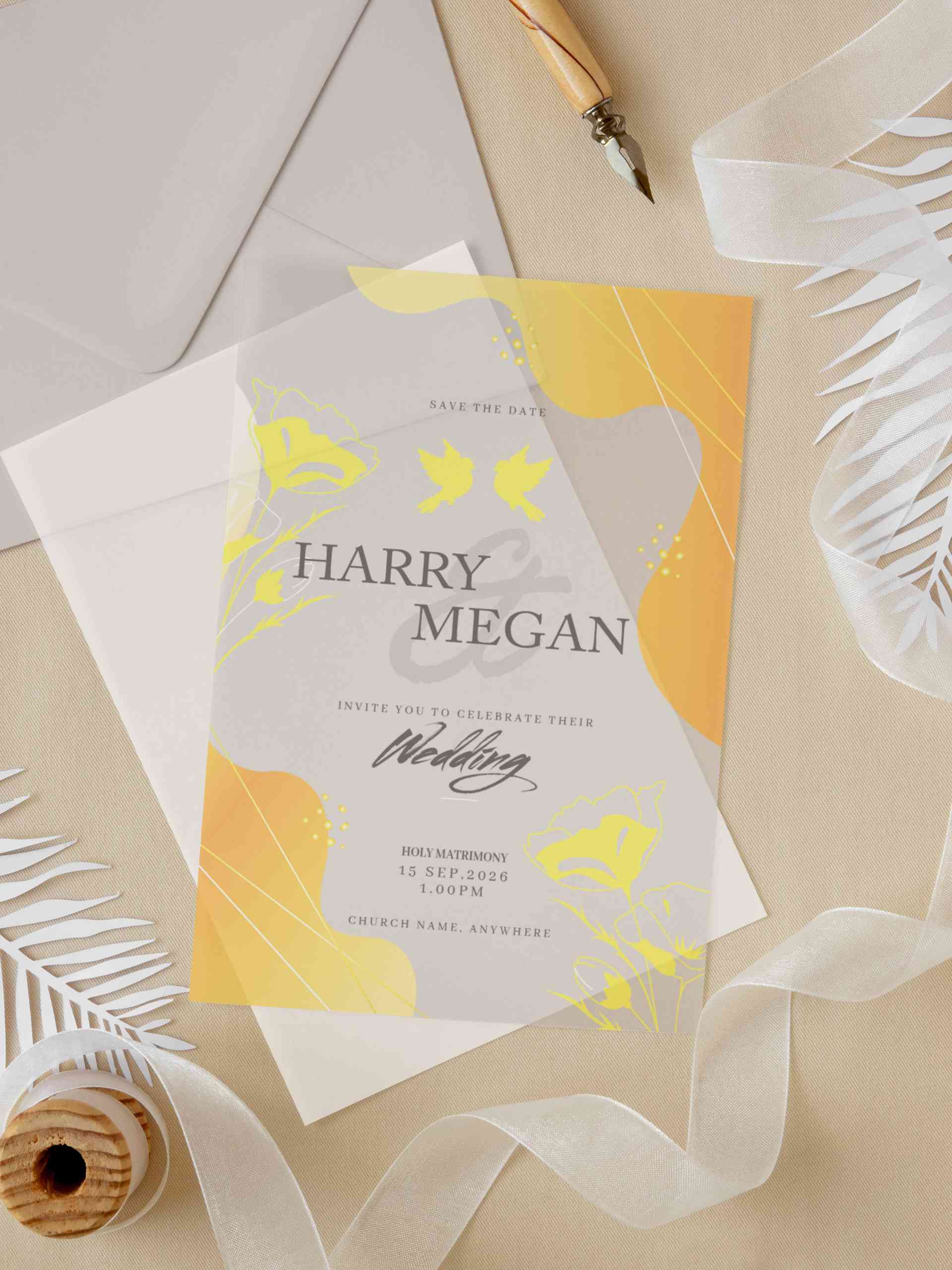 Undangan pernikahan ini menggunakan material akrilik transparan dengan sentuhan desain warna kuning keemasan dan abu muda yang memberikan kesan cerah,...