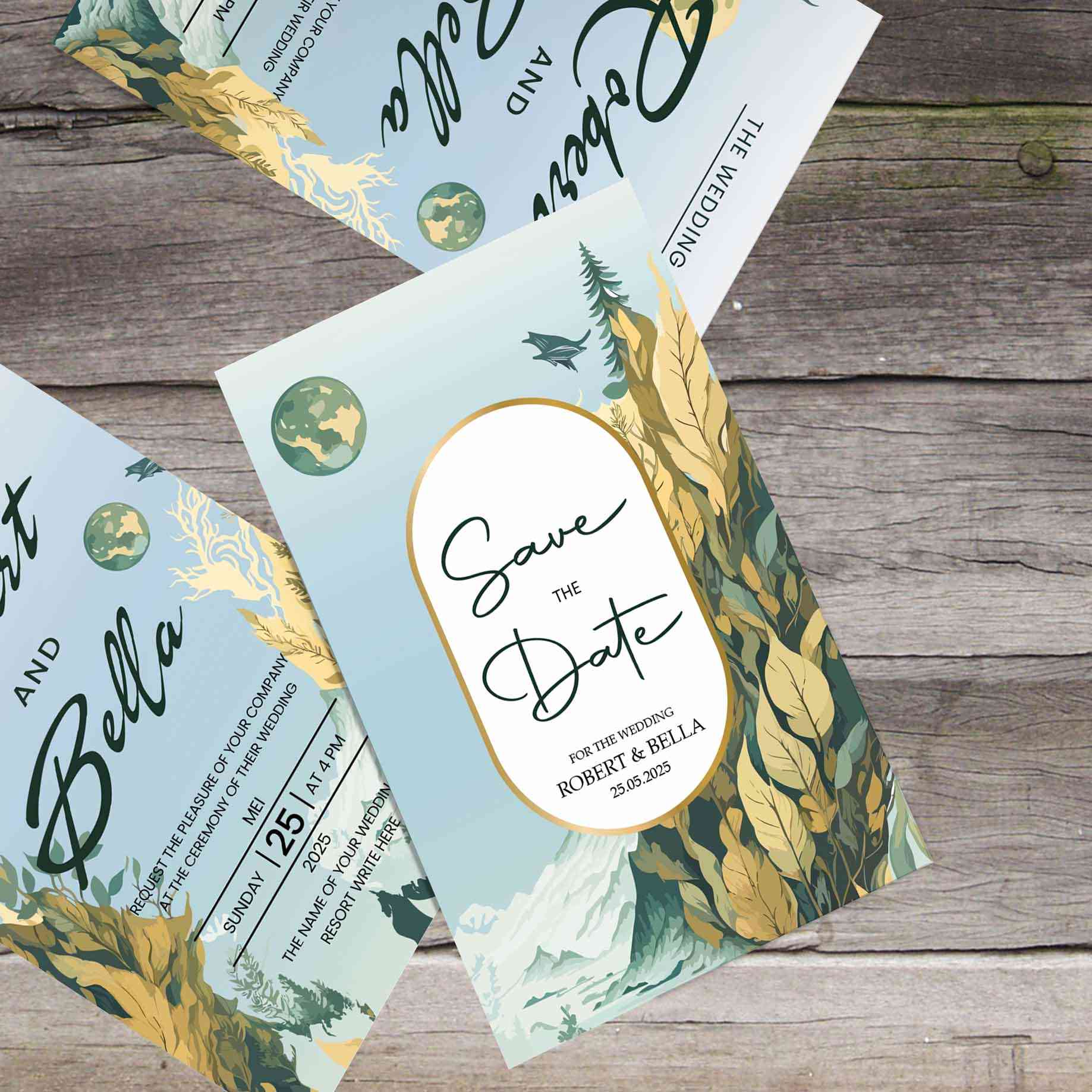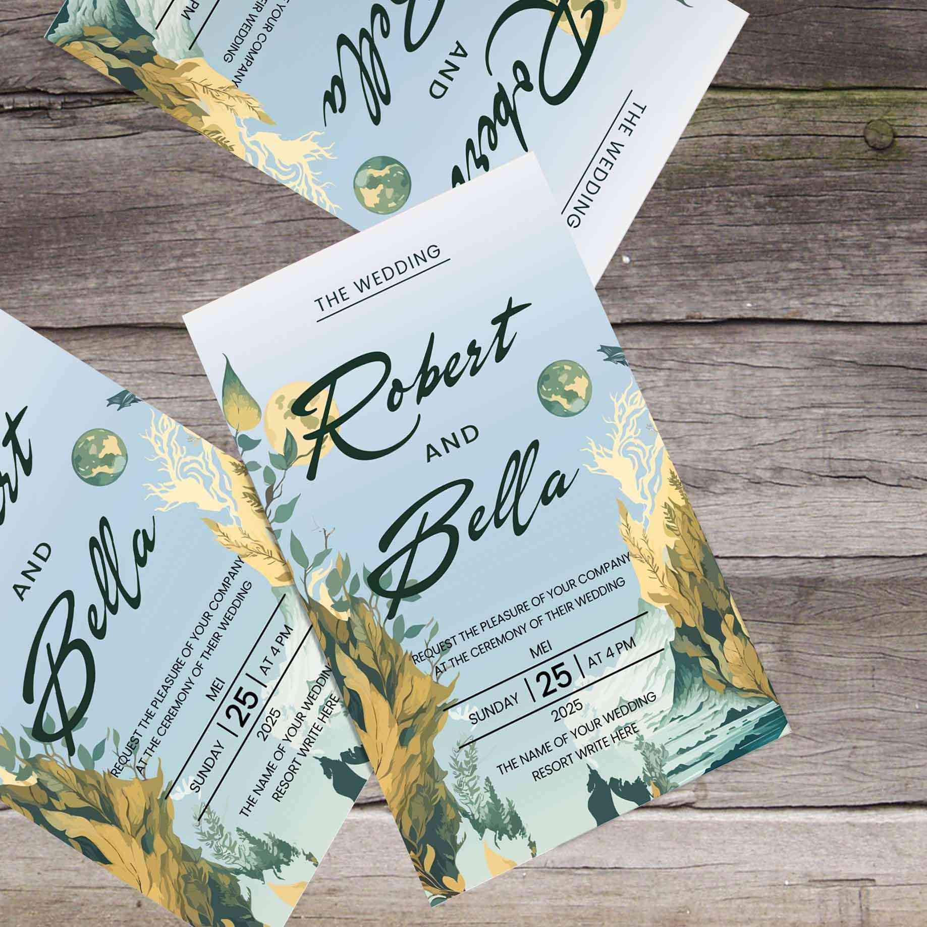 Gambar ini menampilkan desain undangan pernikahan dengan tema alam yang elegan dan modern. Warna dominan dalam desain ini adalah biru pastel yang lemb...