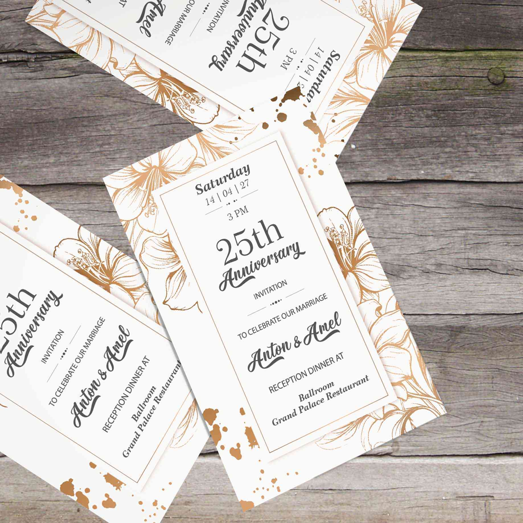 Undangan ini menggunakan kombinasi warna putih dan emas, memberikan kesan mewah dan eksklusif.Bagian latar belakang dihiasi dengan ilustrasi bunga ber...