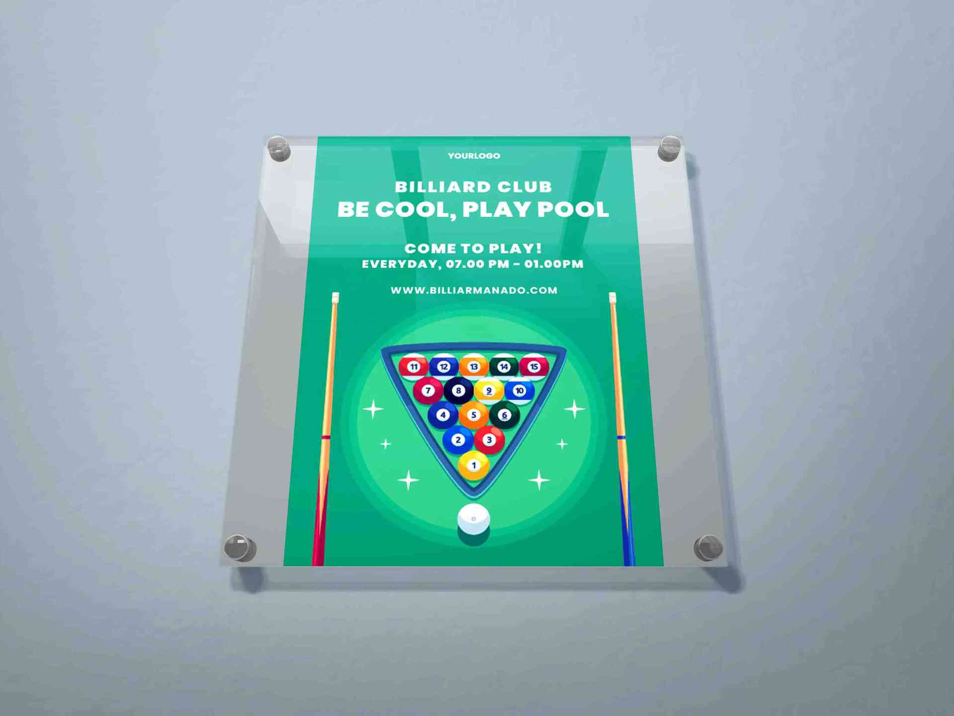 Wall poster bertema Billiard Club ini berbentuk persegi panjang dengan warna dominan hijau dan menampilkan ilustrasi meja biliar lengkap dengan dua st...