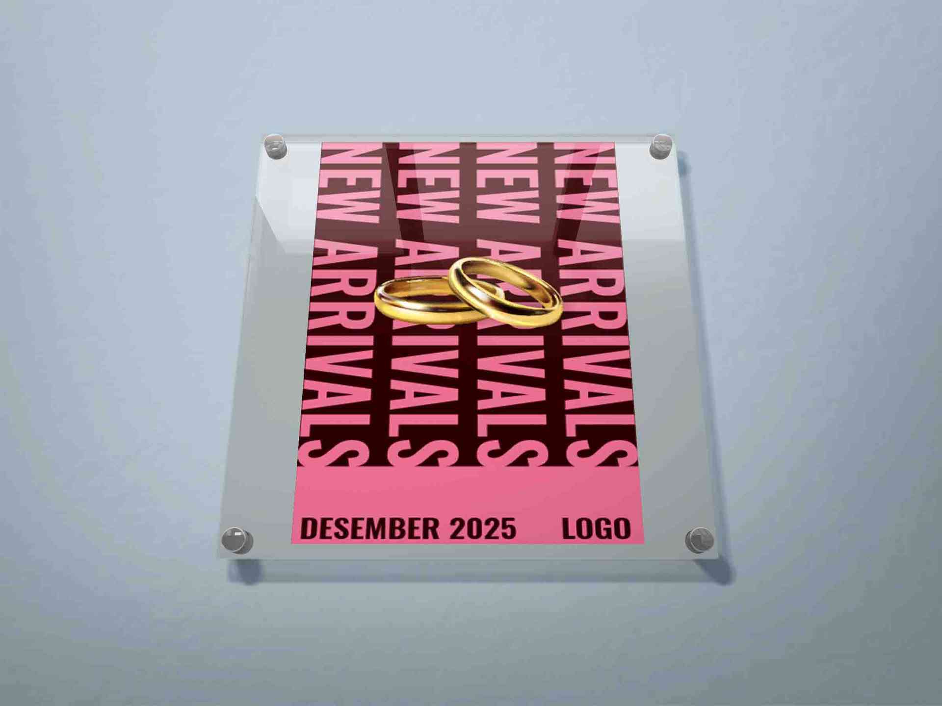 Wall poster promosi produk make up menampilkan desain modern dengan dominasi warna emas dan putih yang berpadu bersih, menghadirkan visual berbagai item kosmetik seperti lipstik, foundation, serum, dan eyeshadow dalam tata letak artistik. Elemen desain utama meliputi label emas bertuliskan "Your Brand", badge "NEW", serta informasi diskon menonjol. Poster ini relevan untuk konteks usaha kecantikan, toko kosmetik, atau promosi brand make up, menyasar konsumen wanita dewasa yang tertarik pada tampilan elegan dan profesional dalam penawaran produk kecantikan.