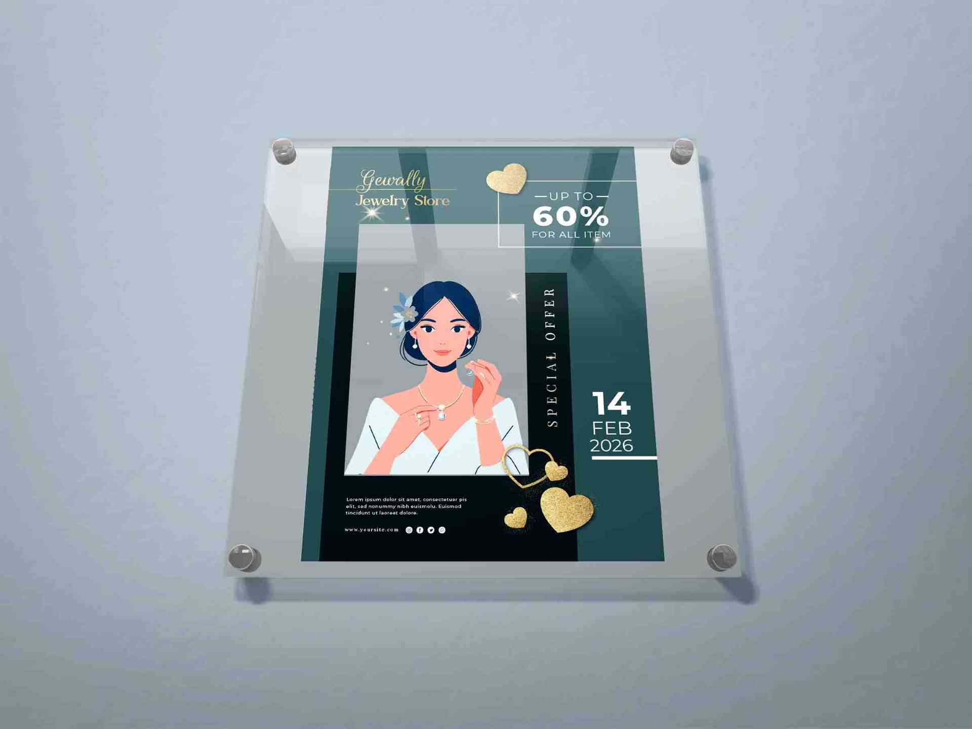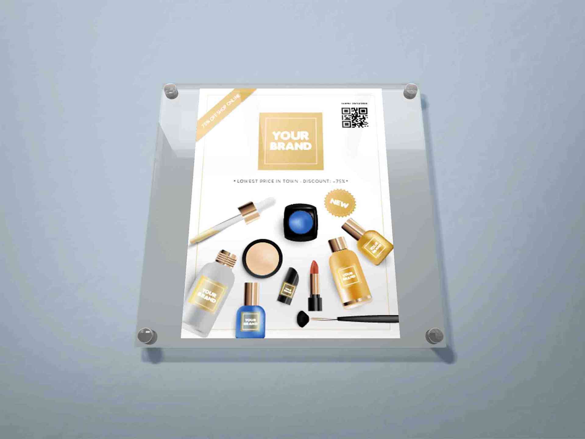 Desain ini merupakan mockup papan informasi atau poster promosi yang dipasang pada dinding menggunakan panel akrilik transparan dengan empat baut stai...
