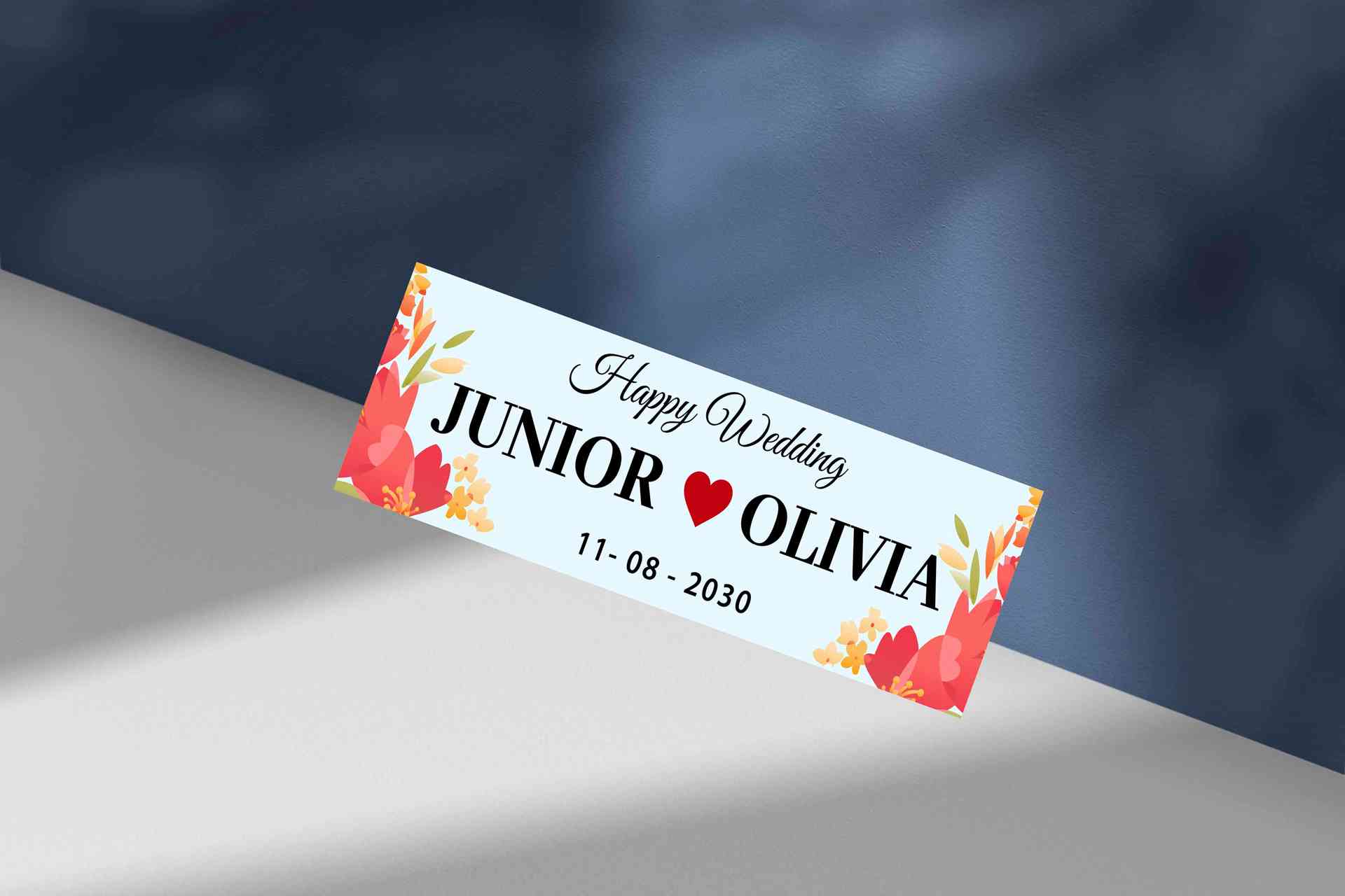 Nama pasangan ditulis besar di bagian tengah dengan font serif tegas berwarna hitam, dipisahkan oleh ikon hati merah yang melambangkan cinta yang bersatu. Di atasnya terdapat kalimat “Happy Wedding” dengan tipografi kaligrafi yang anggun, serta tanggal pernikahan 11 - 08 - 2030 ditampilkan rapi di bawah sebagai pengingat hari bahagia. Desain ini cocok untuk berbagai keperluan dekorasi pernikahan, terutama untuk acara dengan tema rustic chic, garden wedding, hingga konsep minimalis modern.