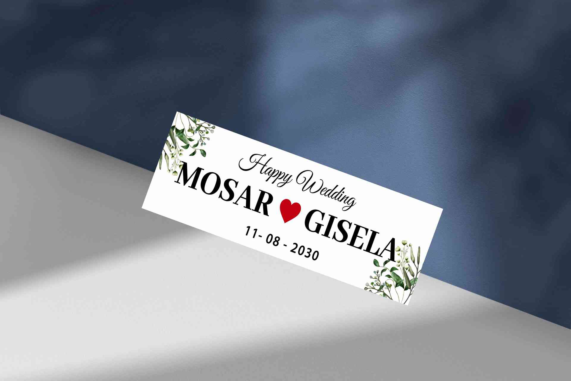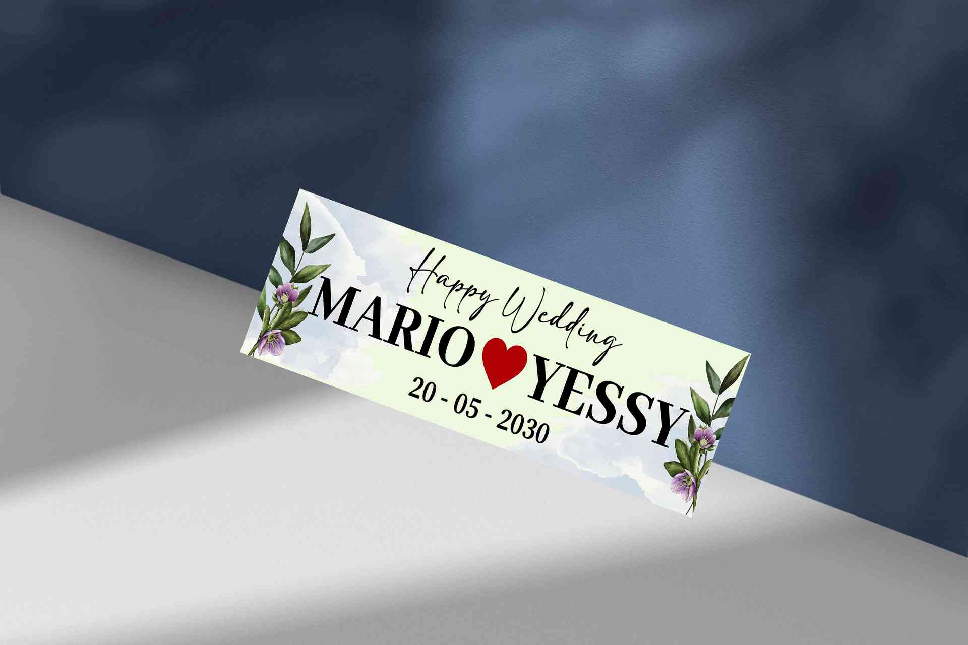 Mengusung warna biru kehijauan yang tenang, desain ini dilengkapi ilustrasi dedaunan hijau yang menambah kesan natural dan segar. Teks putih pada latar biru membuat pesan ‘Happy Wedding’ dan nama pasangan terlihat bersih dan elegan.