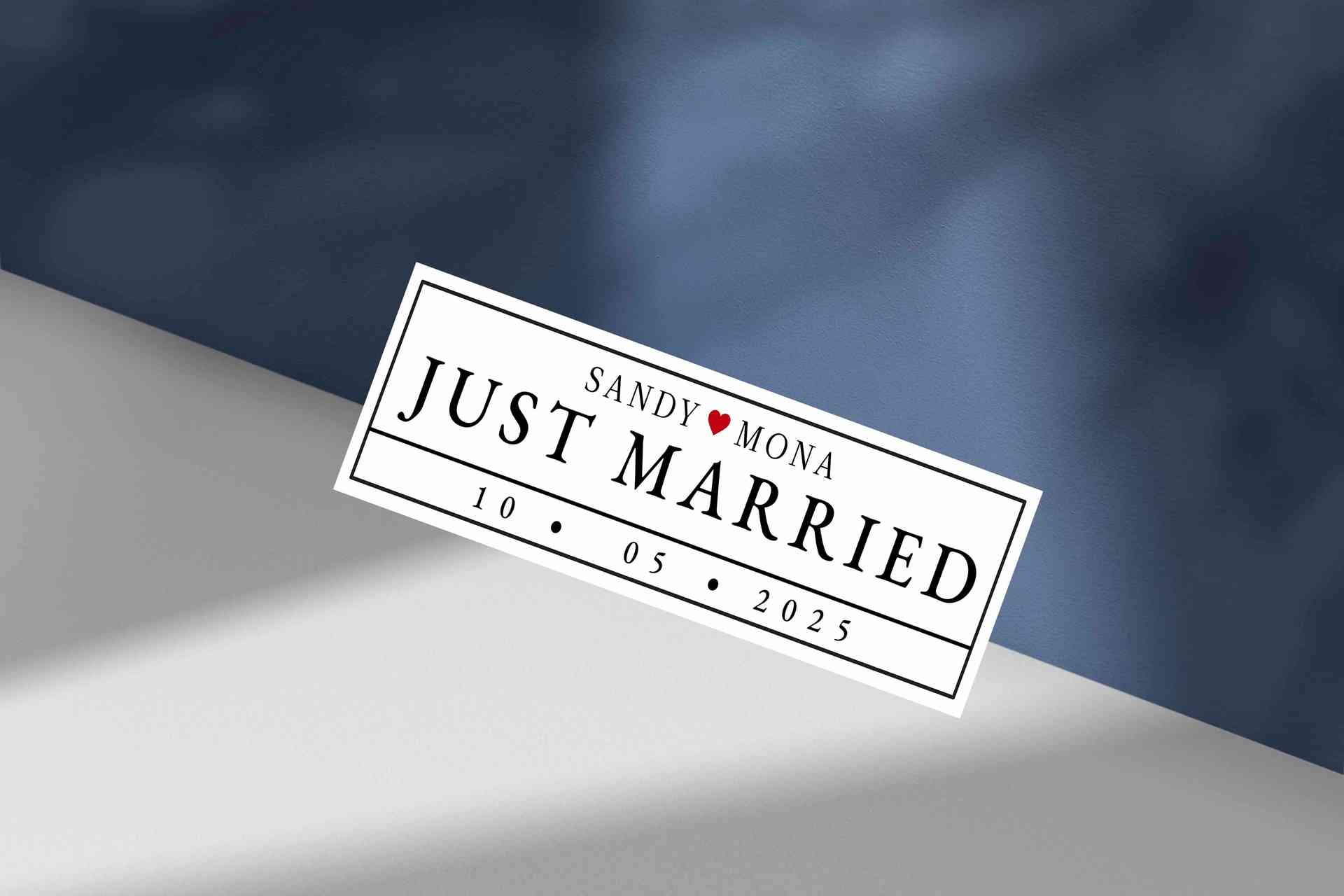 Desain plat pernikahan ini mengusung tema monokrom elegan dengan sentuhan garis tegas dan tipografi klasik berkelas. Teks "JUST MARRIED" ditampilkan d...