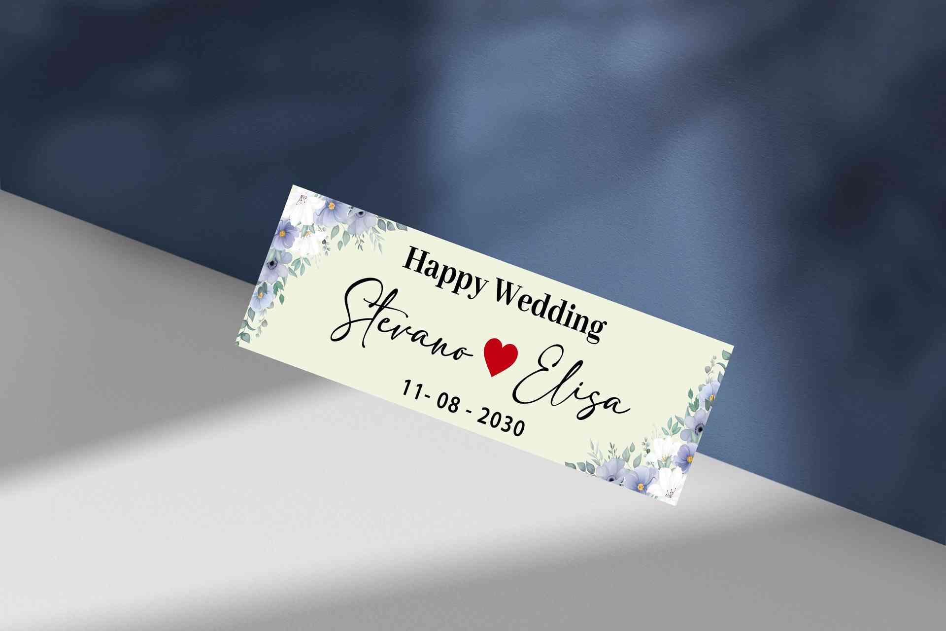 Desain plat pernikahan ini menampilkan gradasi warna biru ke ungu yang memancarkan ketenangan dan kesan sakral. Dengan tulisan happy wedding yang tega...