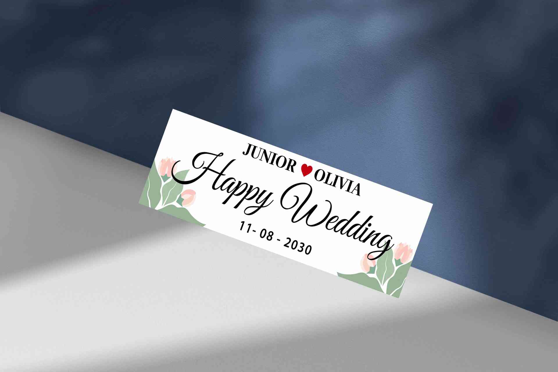 Wedding plat ini menampilkan desain clean dan elegan dengan sentuhan bunga kuning cerah di kedua sisi, menciptakan kesan hangat dan ceria. Tulisan “Happy Wedding” ditulis dalam gaya kaligrafi lembut, sedangkan nama pasangan ditampilkan tegas dengan kombinasi font serif yang klasik. Latar putih polos dengan tekstur halus memberi ruang napas visual, cocok untuk dekorasi pernikahan bertema minimalis modern. Tanggal pernikahan dicetak jelas di bagian bawah, menjadikan plat ini sangat cocok sebagai dekorasi backdrop, tanda meja tamu, ataupun souvenir foto booth.