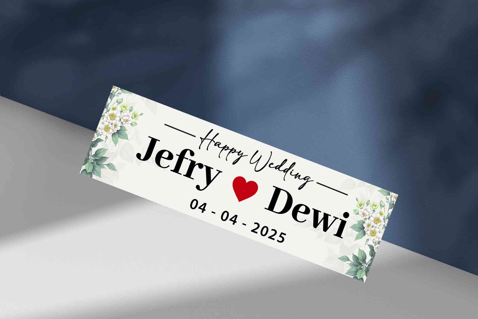 Plat wedding ini tampil menawan dengan kombinasi warna biru muda yang lembut dan aksen bunga merah yang segar di kedua sisi. Nama pasangan ditampilkan...