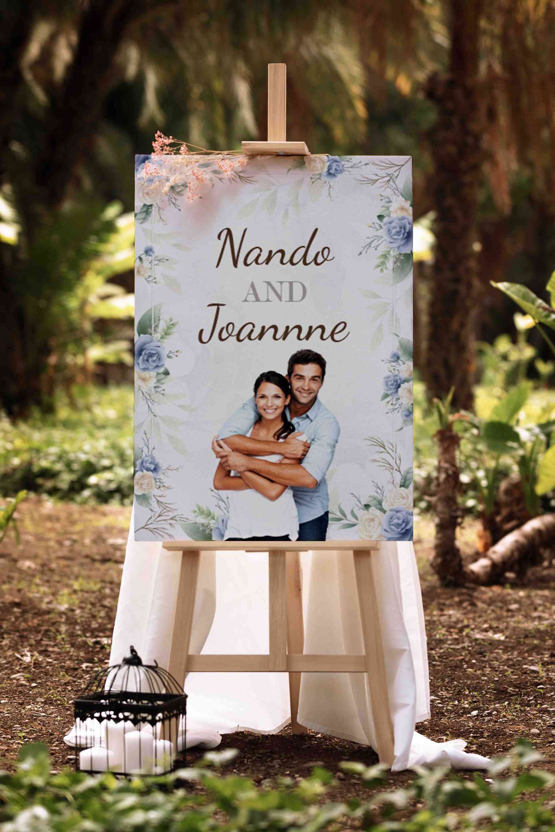 Wedding sign bertema bunga biru putih ini memiliki desain berbentuk persegi panjang vertikal dengan karakter utama berupa nama pasangan dan foto merek...