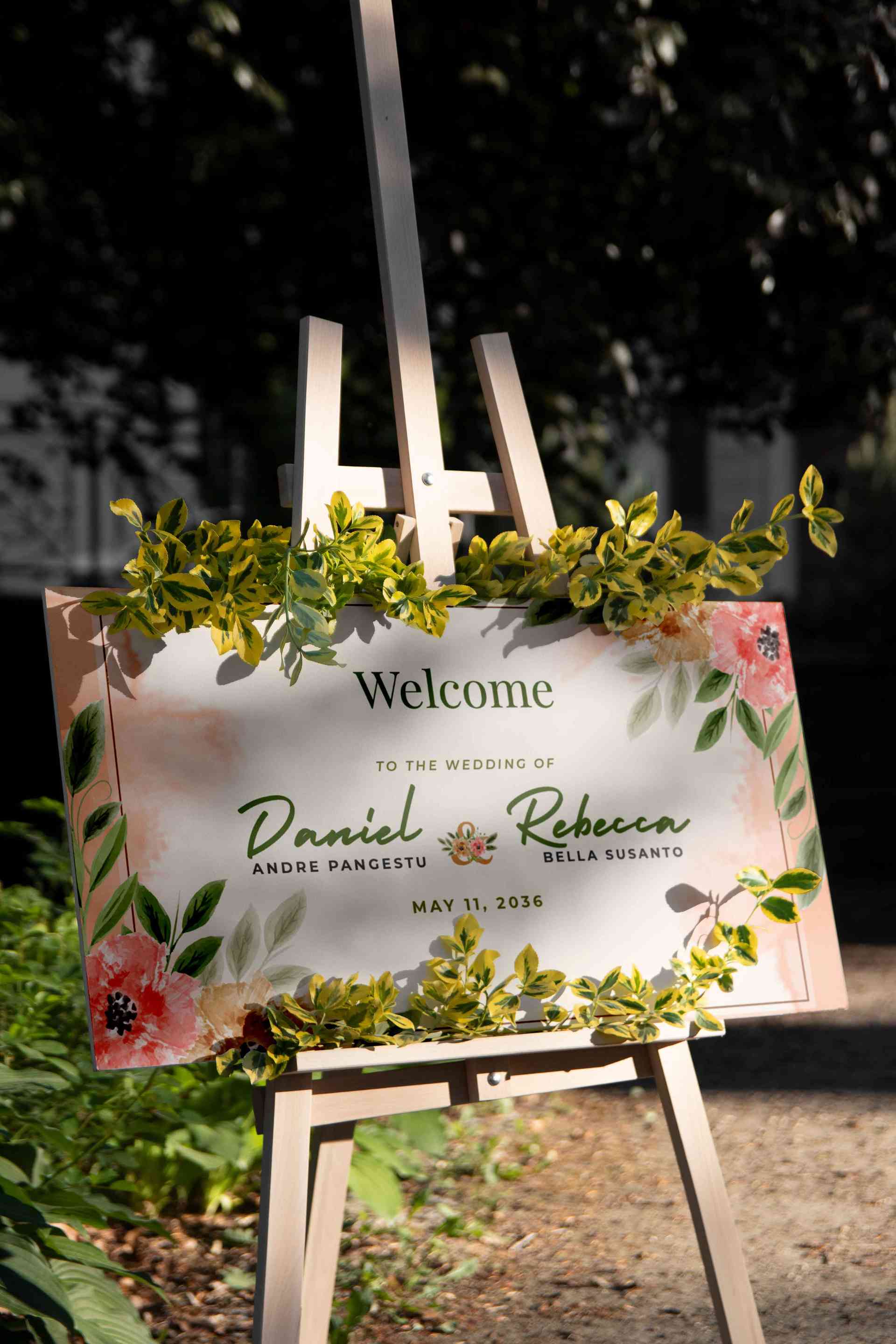 Desain welcome sign ini menampilkan nuansa floral soft pastel yang elegan dan romantis. Latar belakang berwarna krem dengan gradasi peach lembut membe...