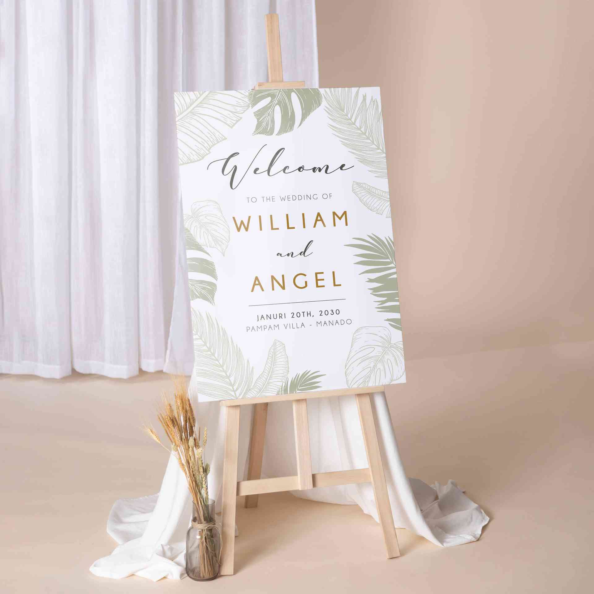 πΏ Wedding Welcome Sign Bertema Tropikal Minimalis untuk Pernikahan Outdoor! πΏ Desain signboard pernikahan ini tampil segar dan modern dengan balutan...