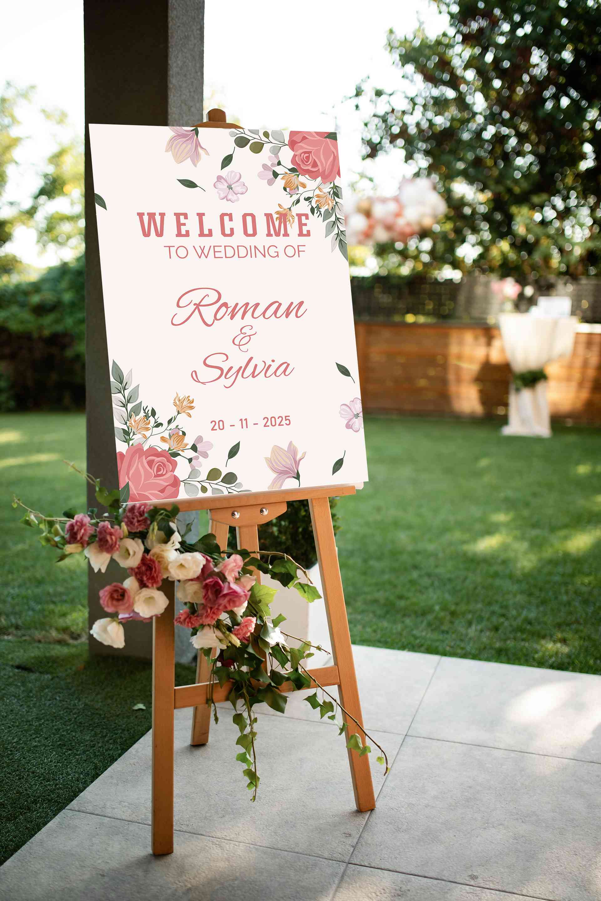Welcome sign ini tampil dengan nuansa warna netral dan sentuhan floral yang anggun, menonjolkan kesan elegan dan romantis. Menggunakan kombinasi font klasik dan modern, desain ini memberikan sambutan hangat kepada para tamu yang hadir. Dihiasi dengan rangkaian bunga segar pada bagian kaki easel serta aksen dedaunan menjuntai, keseluruhan tampilan sign ini memperkuat suasana intimate garden wedding. Tertulis dengan jelas nama mempelai, tanggal pernikahan, serta placeholder untuk lokasi pelaksanaan, menjadikan sign ini tidak hanya informatif tapi juga menambah estetika dekorasi pernikahan.