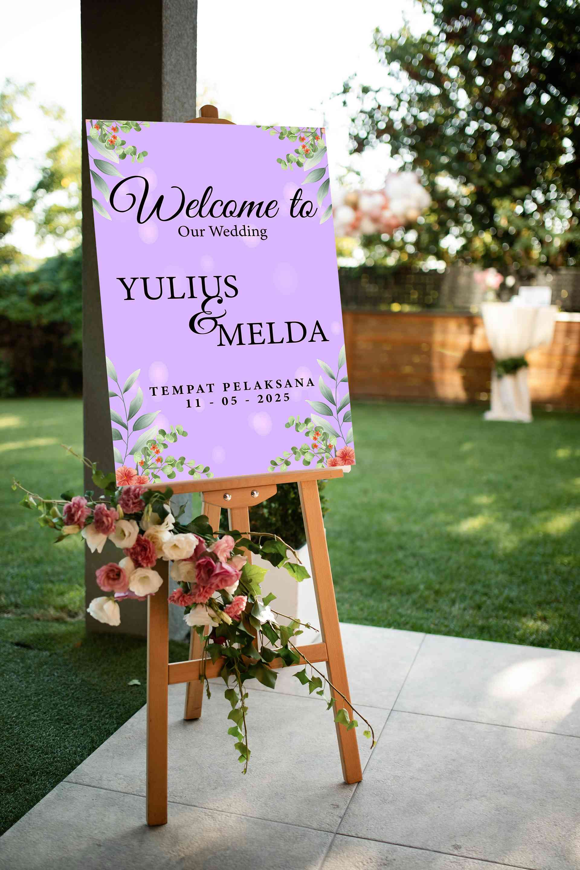 Welcome sign ini dirancang khusus untuk memperindah suasana pernikahan dengan tema warna ungu yang anggun dan memikat. Desain latar menggunakan gradas...