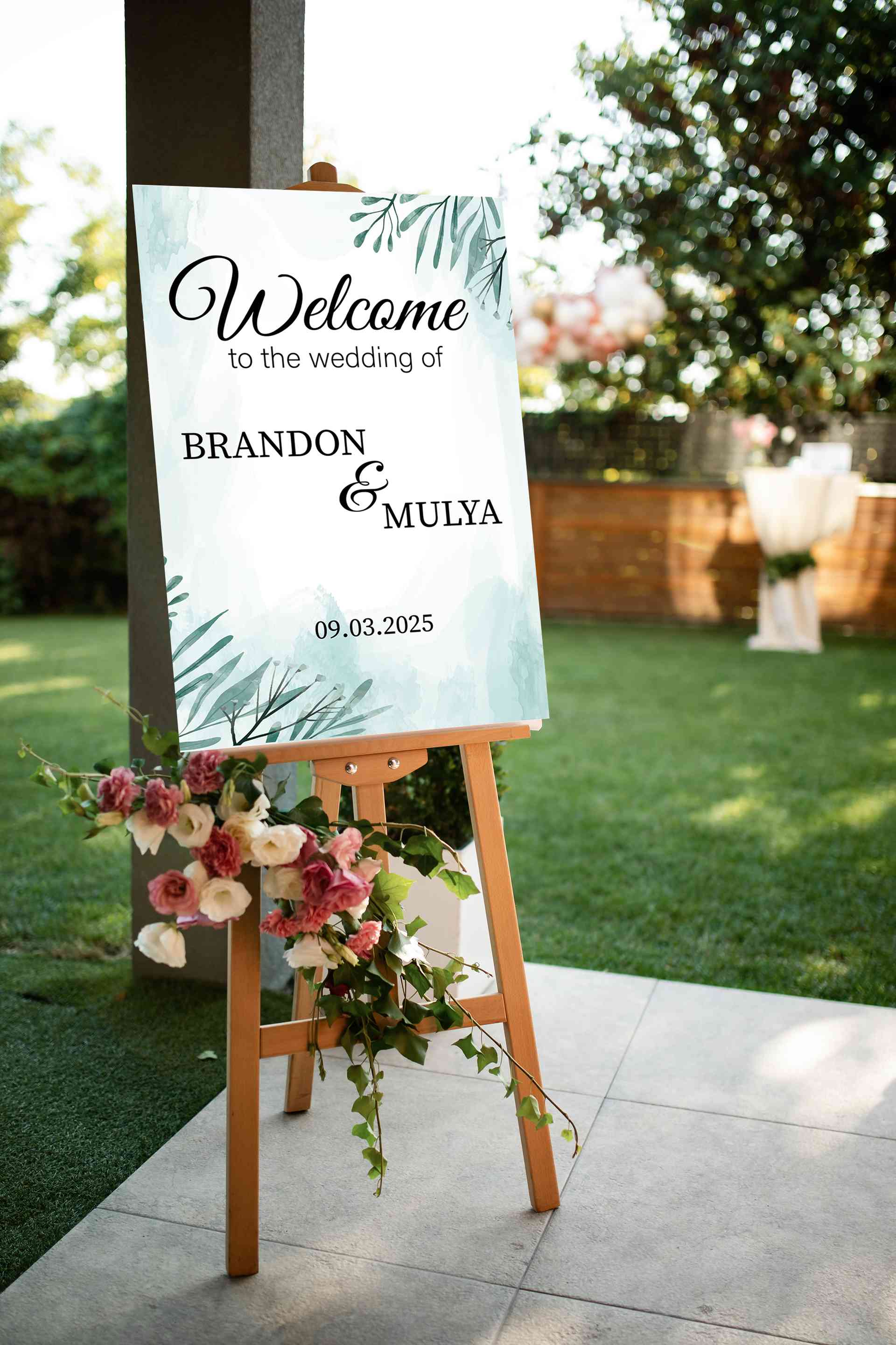 Sebuah papan Welcome Sign Wedding yang elegan dengan desain floral berdiri di atas easel kayu, menyambut tamu undangan dalam acara pernikahan mempelai...