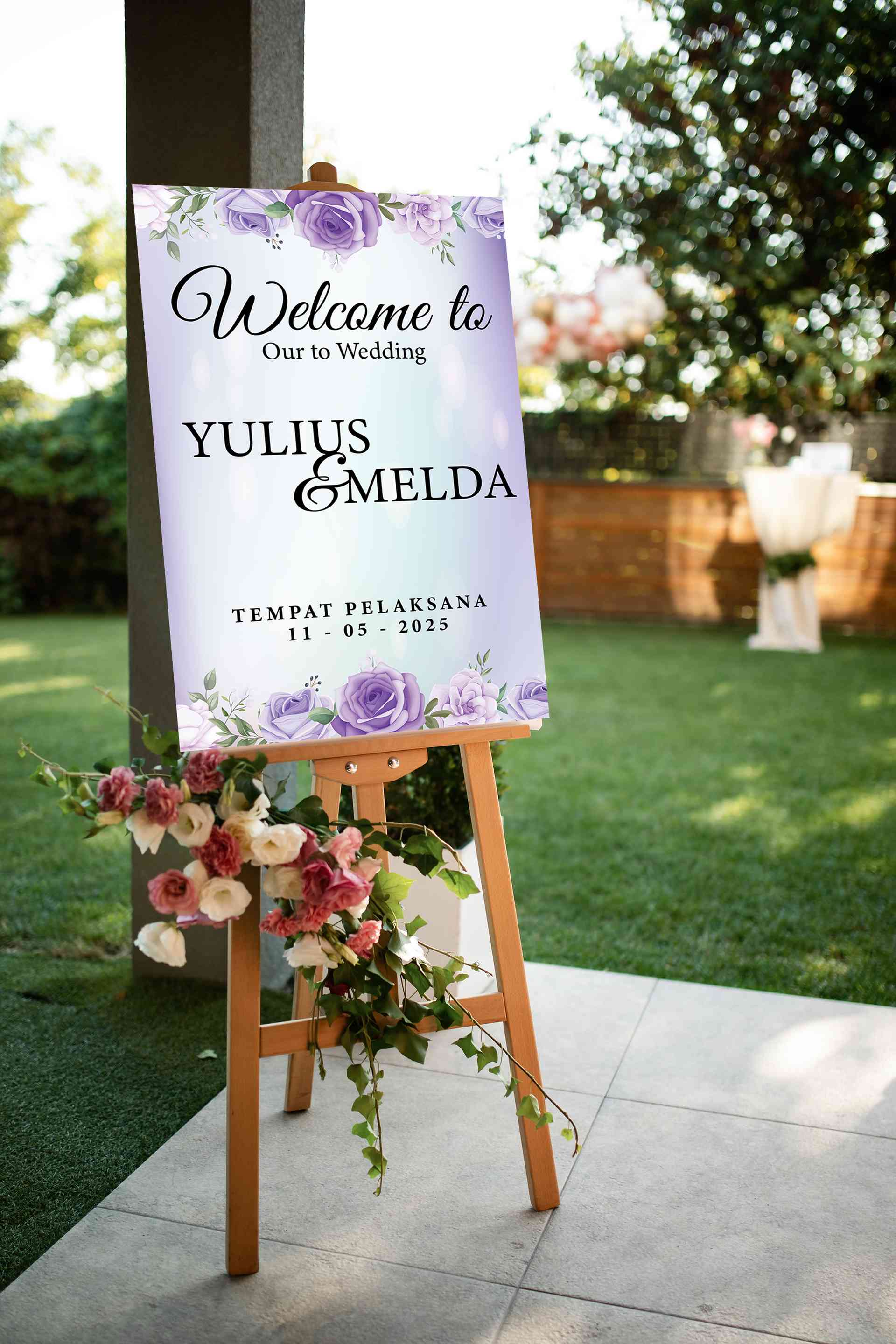 Welcome sign pernikahan ini dirancang dengan nuansa elegan dan romantis untuk menyambut tamu undangan secara hangat di hari spesial. Dengan latar gradasi ungu-putih yang lembut, desain ini dilengkapi sentuhan bunga dahlia pink yang mempermanis tampilan di bagian atas dan bawah. Tulisan ditata dengan kombinasi font kaligrafi dan formal, memberi kesan mewah namun tetap bersahaja. Nama mempelai tampil dominan di tengah, disertai lokasi dan tanggal acara sebagai pelengkap informasi. Diletakkan di atas standing kayu dengan hiasan bunga segar, produk ini sangat cocok untuk dekorasi pintu masuk venue, area photobooth, atau gerbang pelaminan.