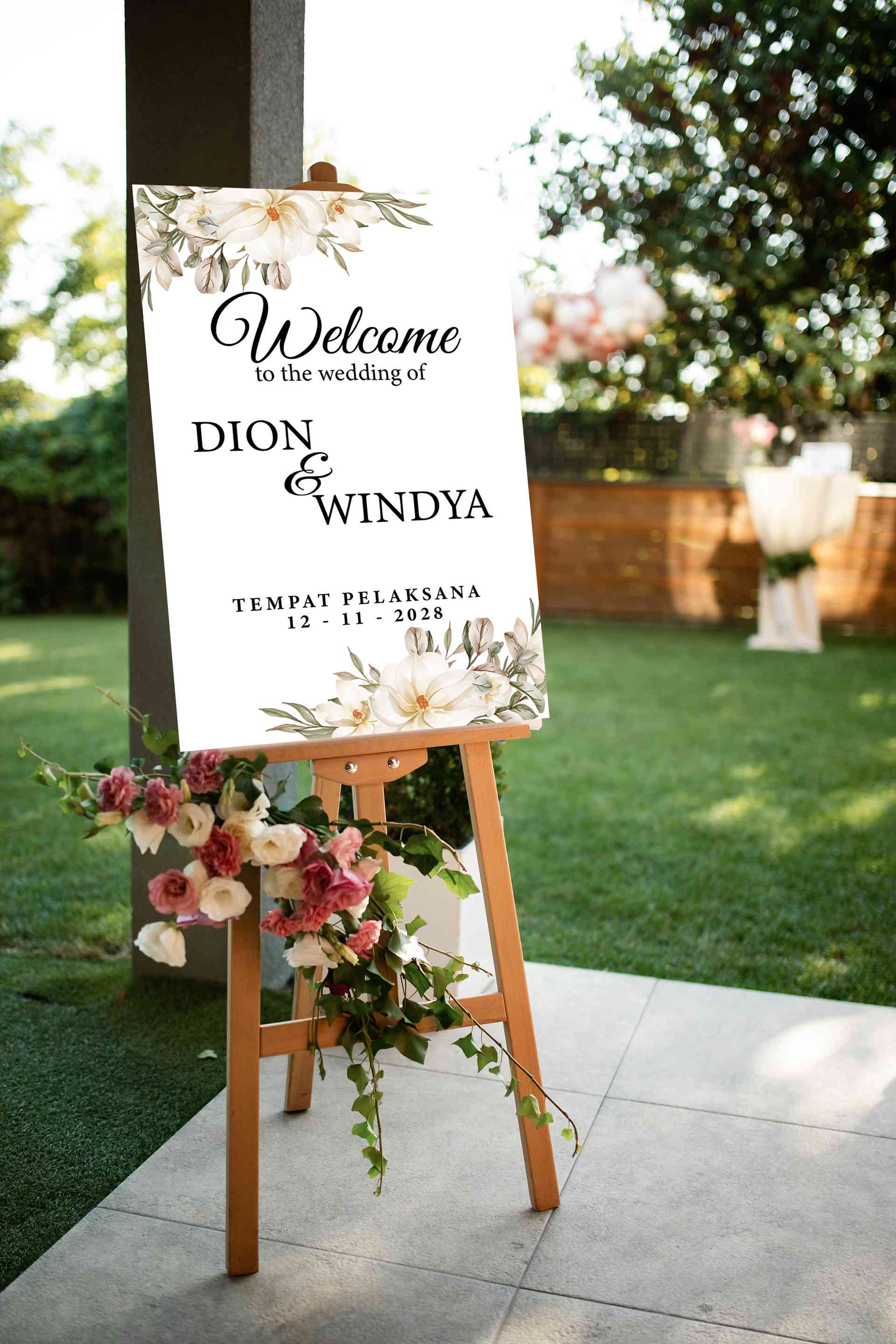 Welcome sign ini adalah papan penyambutan tamu untuk pernikahan. Desainnya elegan dengan latar putih, dihiasi ilustrasi bunga magnolia berwarna krem d...