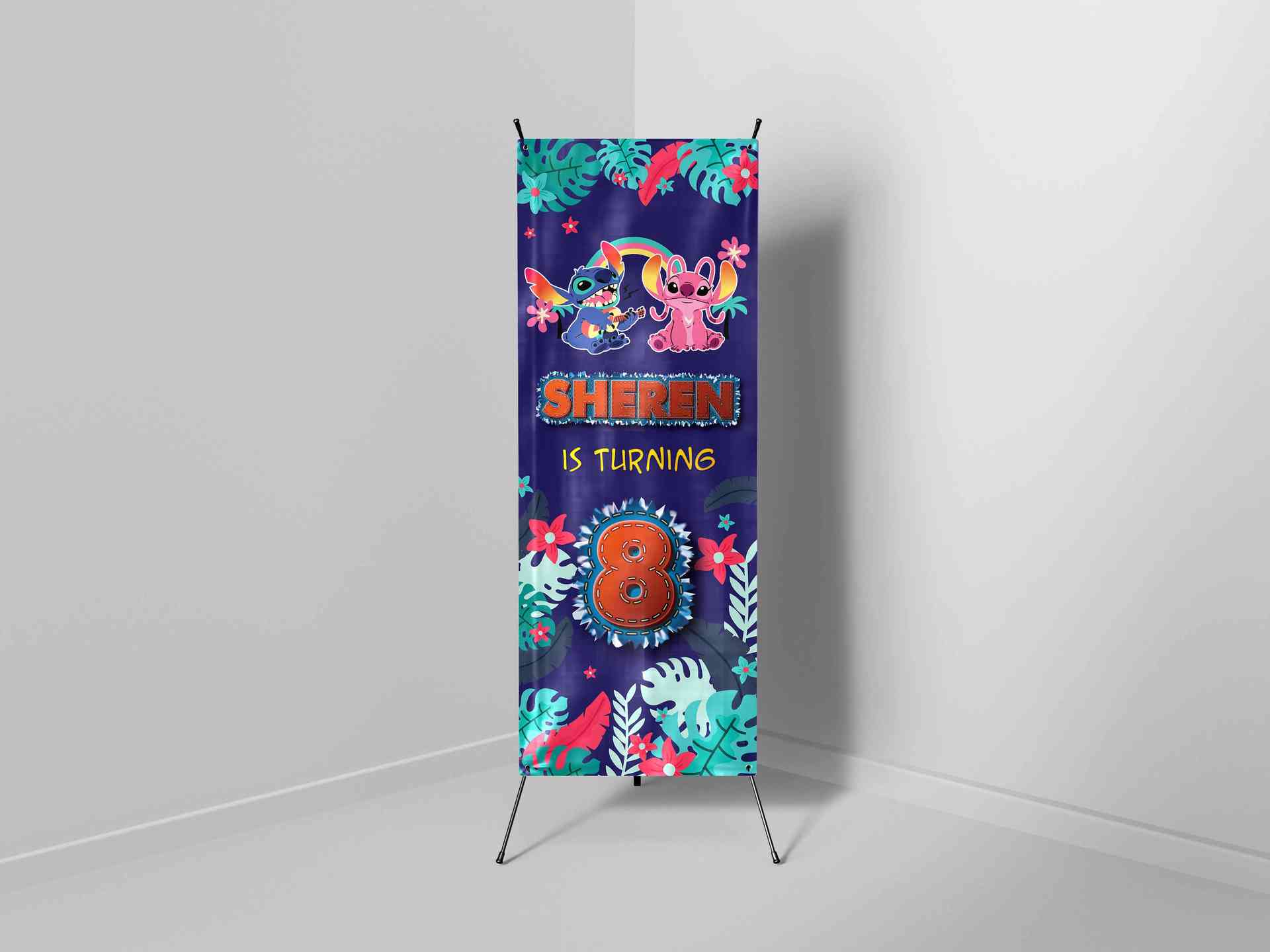 Desain X-Banner ulang tahun ini menampilkan karakter Stitch dan Angel dengan latar belakang nuansa tropikal yang cerah dan menyenangkan. Dominasi warn...