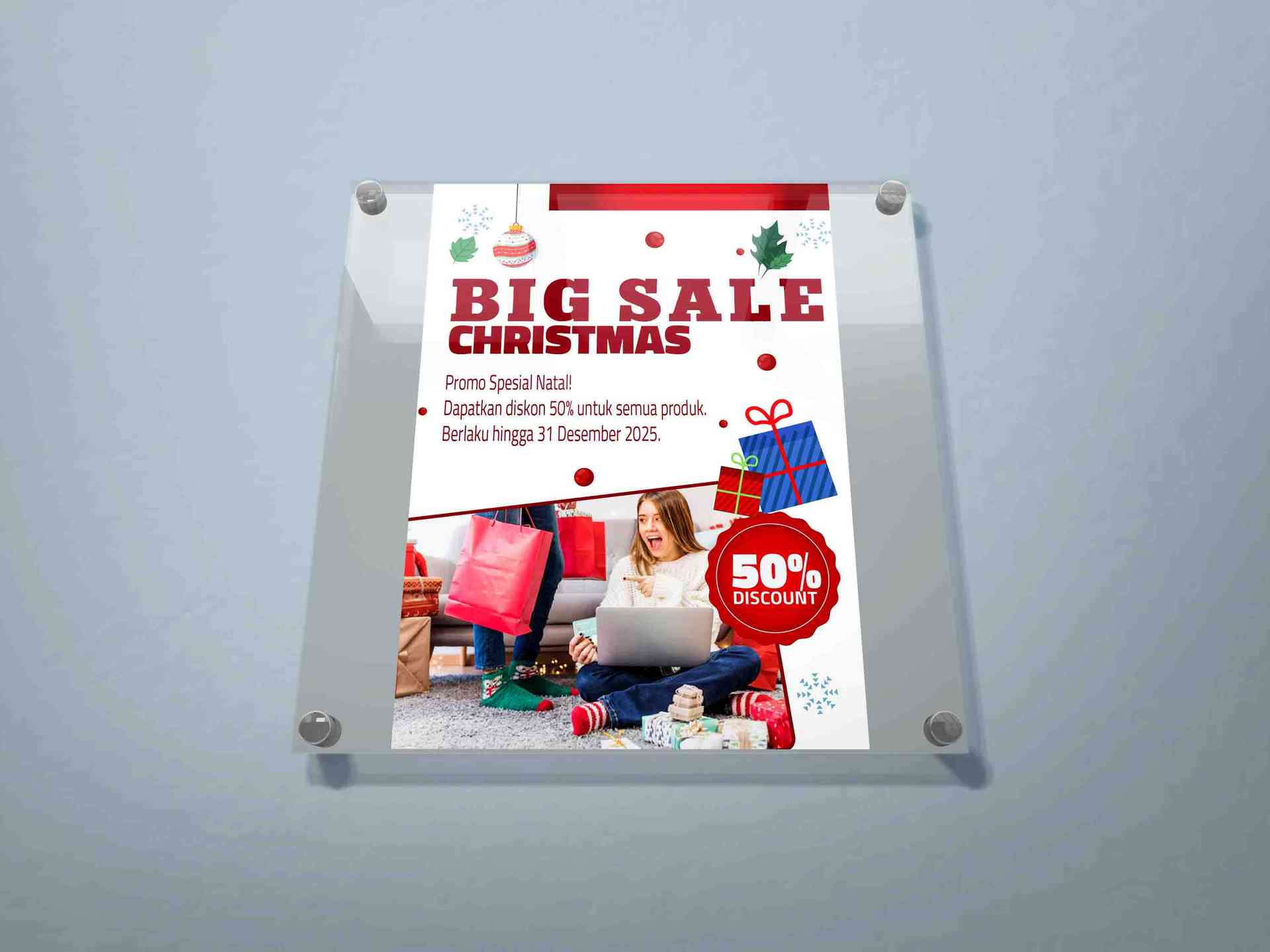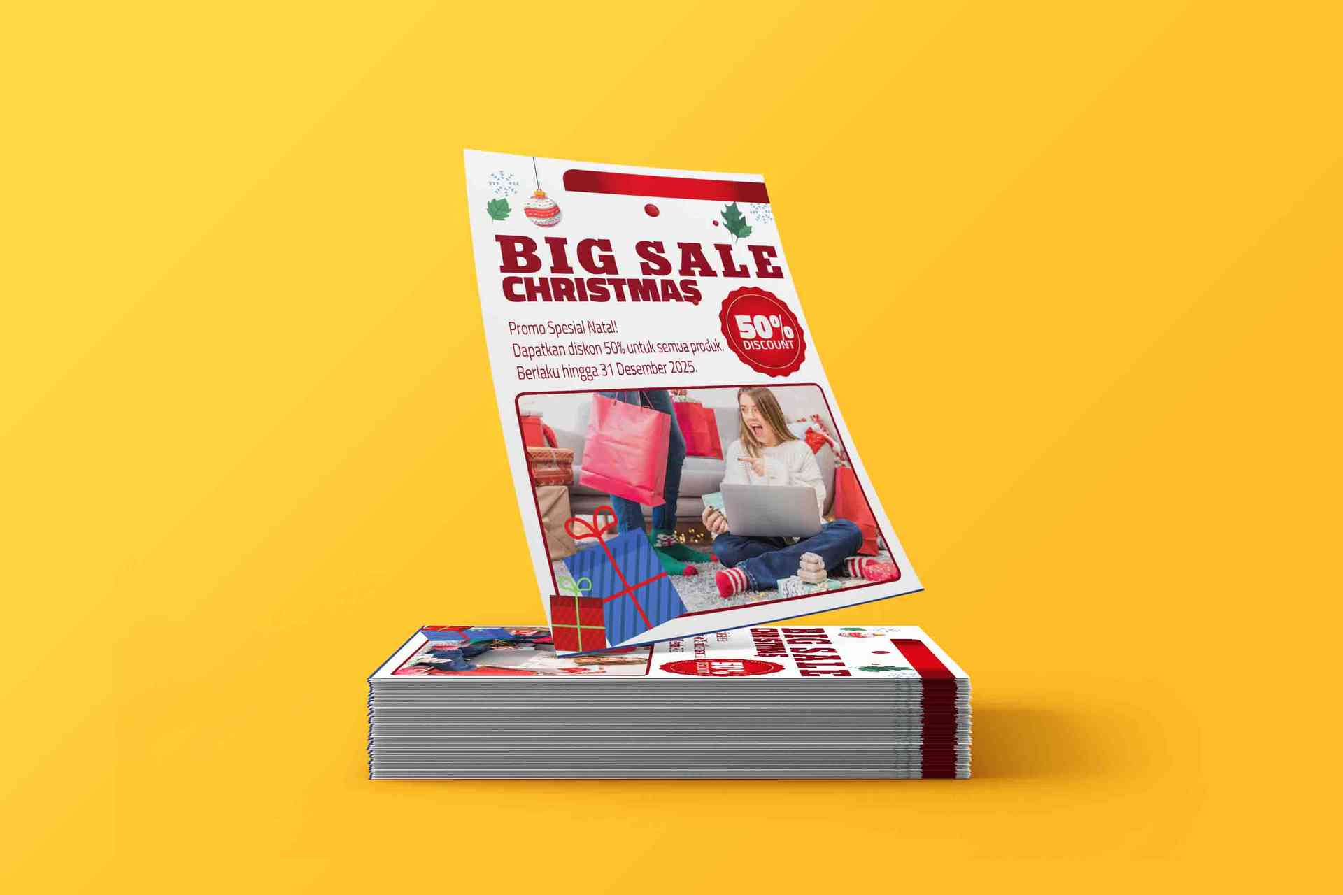 Wall poster bertema “Big Sale Christmas” ini berbentuk persegi panjang dengan dominasi warna merah dan putih yang mencolok. Elemen visual utama melipu...