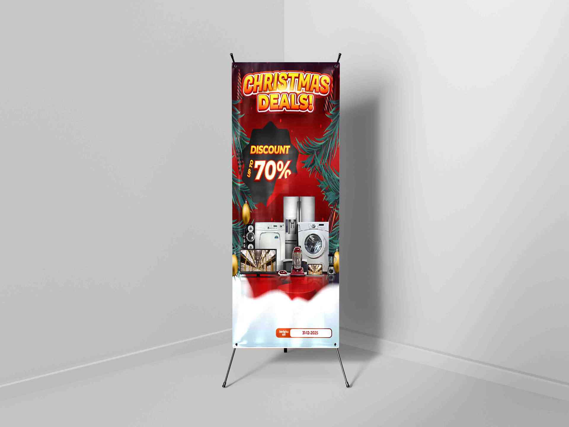 X Banner Christmas Deals Nuansa Blue Christmas mengusung bentuk vertikal dengan dominasi warna biru tua yang dihiasi visual bintang dan nuansa malam, menonjolkan tulisan besar “CHRISTMAS DEALS!” berwarna merah-oranye dengan efek outline tebal putih dan kuning. Elemen desain utama berupa tipografi promo yang kuat serta ilustrasi peralatan elektronik seperti kulkas, mesin cuci, dan oven di bagian bawah mempertegas tema penawaran diskon besar produk rumah tangga menjelang Natal. Banner ini ideal digunakan pada area ritel, toko elektronik, atau pusat perbelanjaan, menargetkan konsumen yang mencari promo spesial akhir tahun.