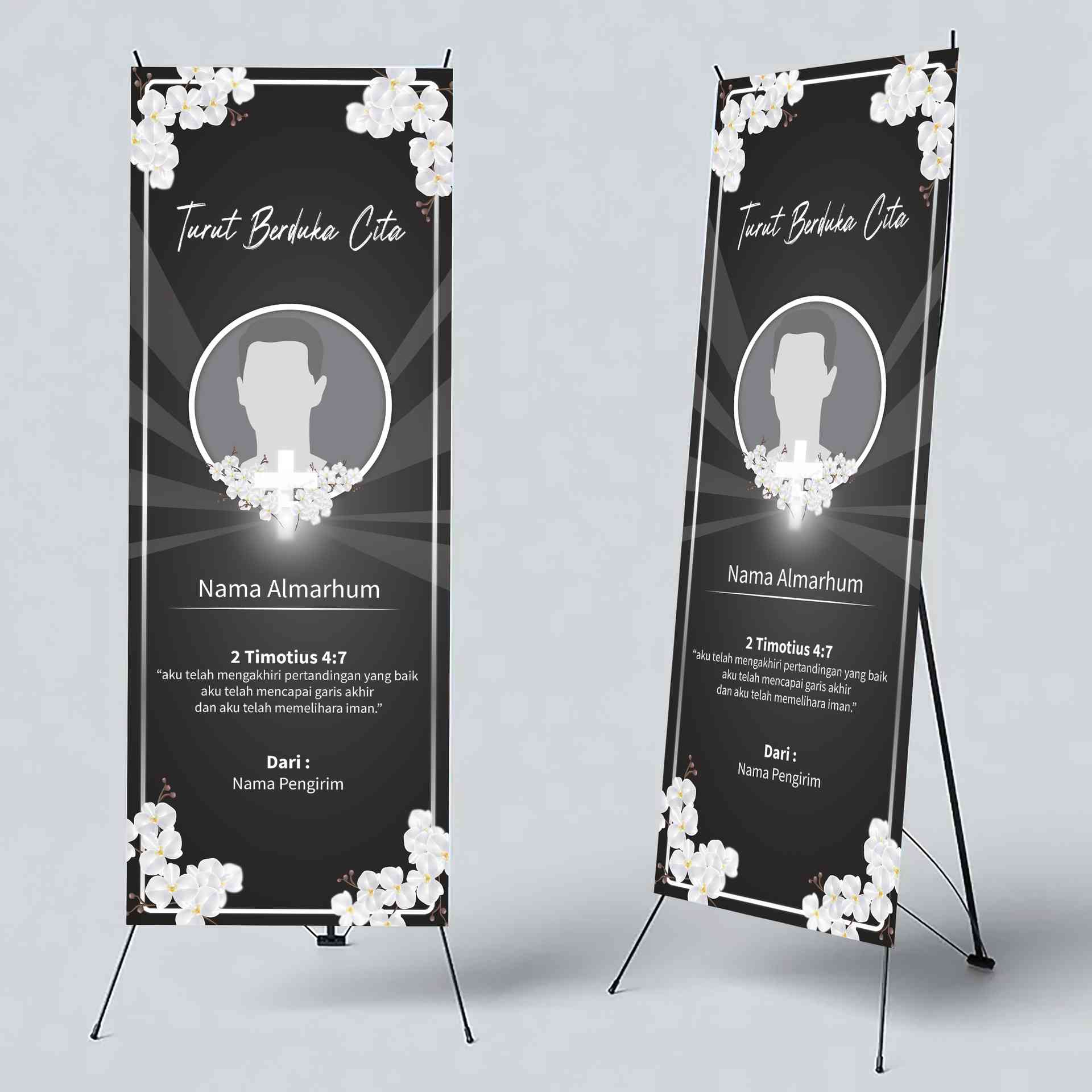 Desain ini merupakan xbanner ucapan duka cita yang didominasi oleh warna hitam dan putih untuk menunjukkan suasana berkabung dan penghormatan terakhir. Teks "Turut Berduka Cita Atas Meninggalnya" ditampilkan dengan font klasik elegan di bagian atas. Di bagian tengah terdapat area siluet untuk tempat foto almarhum/almarhumah dengan latar belakang awan dan burung merpati putih yang melambangkan kedamaian dan kepergian jiwa ke tempat yang lebih baik. Tulisan “In Loving Memories” dan “Name Here” memberi ruang bagi penyesuaian nama. Di bawahnya, dituliskan identitas keluarga serta siapa yang mengirimkan ucapan belasungkawa. Ornamen floral di sudut atas dan bawah banner menambah kesan sakral dan hormat. Banner ini sangat cocok digunakan di rumah duka atau acara pemakaman sebagai bentuk penghormatan.