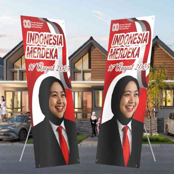 X Banner Ceria Kemerdekaan dengan Senyum Penuh Semangat merupakan media promosi berbentuk banner vertikal berukuran besar yang dirancang untuk memperi...