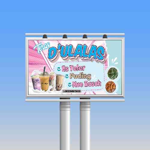 baliho promosi untuk sebuah usaha kuliner bernama Teras DāULALAS. Secara visual, baliho ini memiliki tampilan yang cerah dan menarik perhatian dengan...