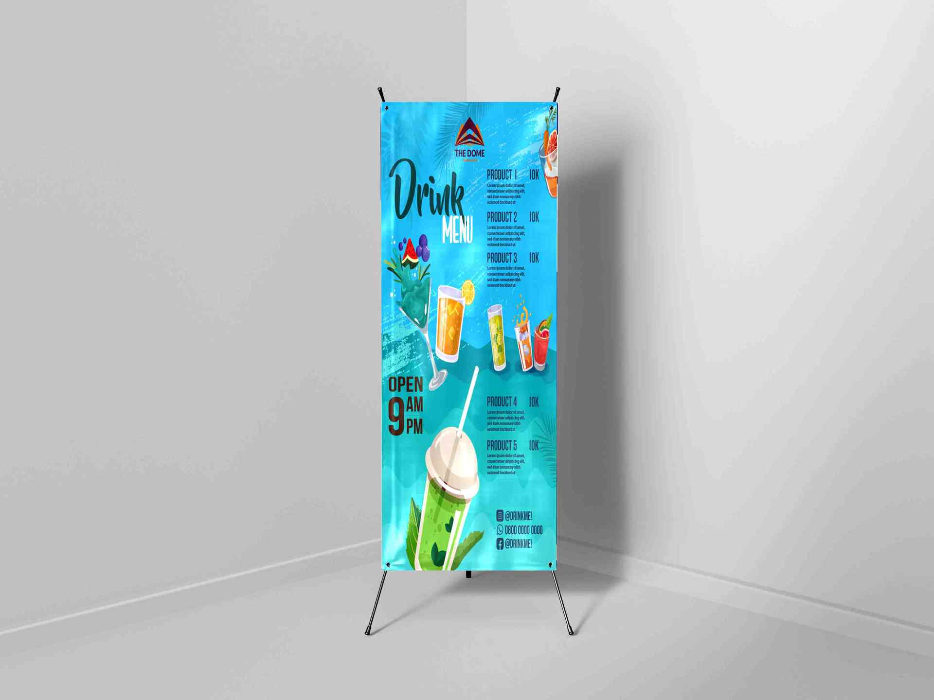 Gambar ini menampilkan dua jenis banner menu minuman dengan desain yang serupa tetapi menggunakan media display yang berbeda. Berikut adalah deskripsi...
