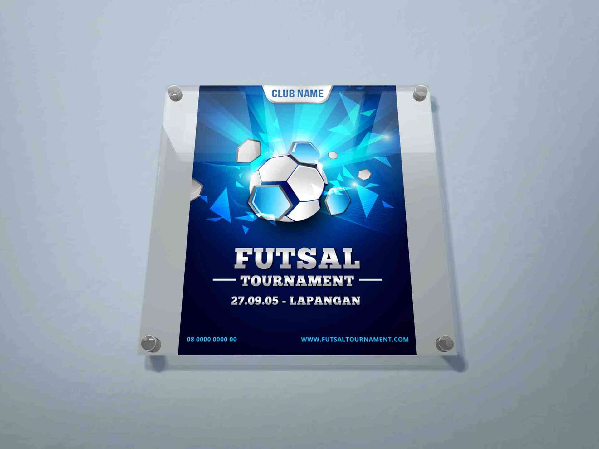 Wall poster bertema Futsal Tournament ini berbentuk persegi dengan desain visual utama berupa ilustrasi bola futsal tiga dimensi yang dinamis di tenga...
