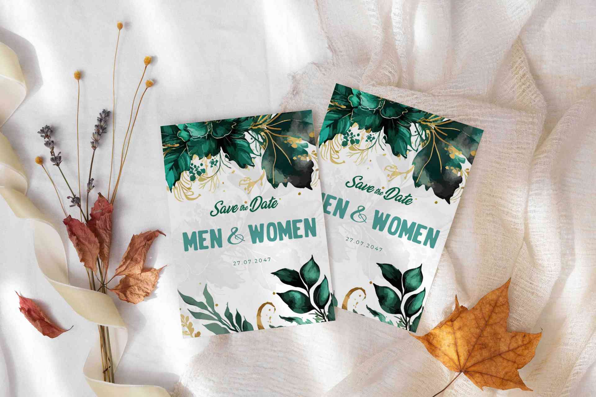 Undangan pernikahan bercorak botanical ini menampilkan desain dua sisi dengan motif daun berwarna hijau dan sentuhan emas yang artistik, menghadirkan...
