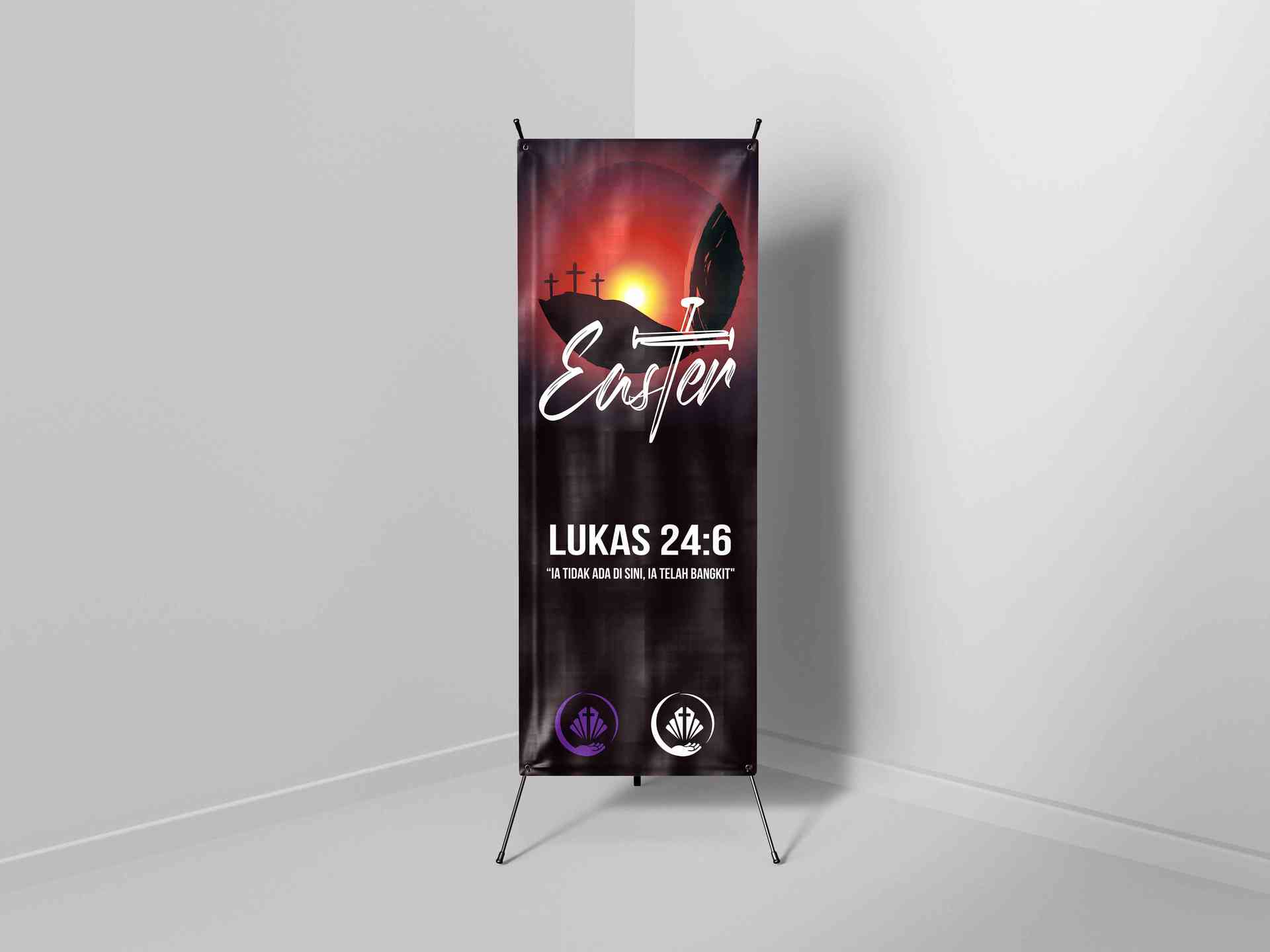 esain X-Banner ini mengangkat tema Paskah dengan nuansa dramatik dan penuh makna, ditampilkan lewat penggunaan warna gelap seperti ungu kehitaman dan...