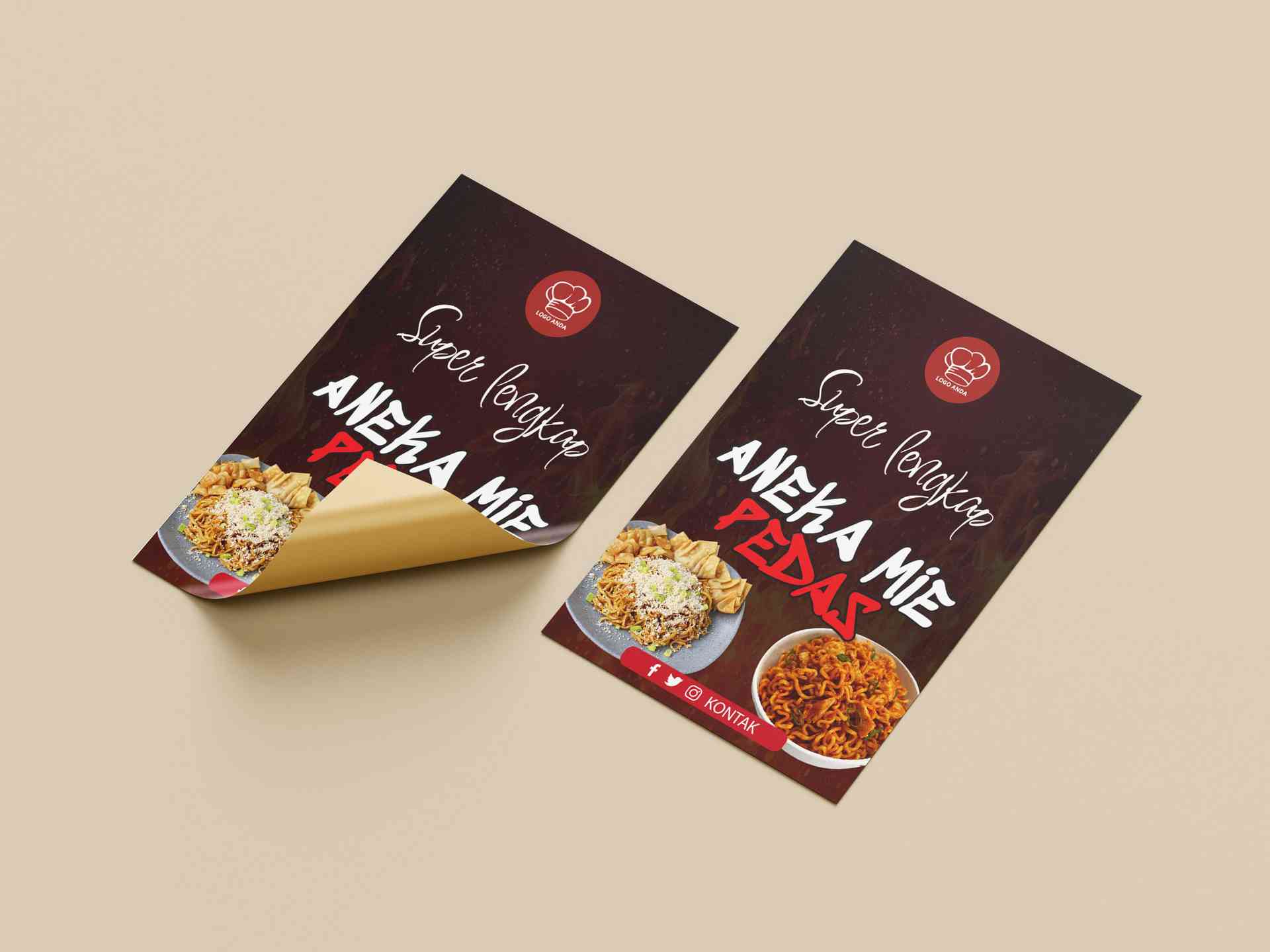 Banner ini menampilkan promo “Aneka Mie Pedas” dengan desain yang mencolok, didominasi warna merah dan hitam untuk menggambarkan sensasi pedas. Visual dua piring mie yang menggugah selera membuat pelanggan langsung tertarik, dilengkapi informasi kontak media sosial di bagian bawah untuk pemesanan cepat.