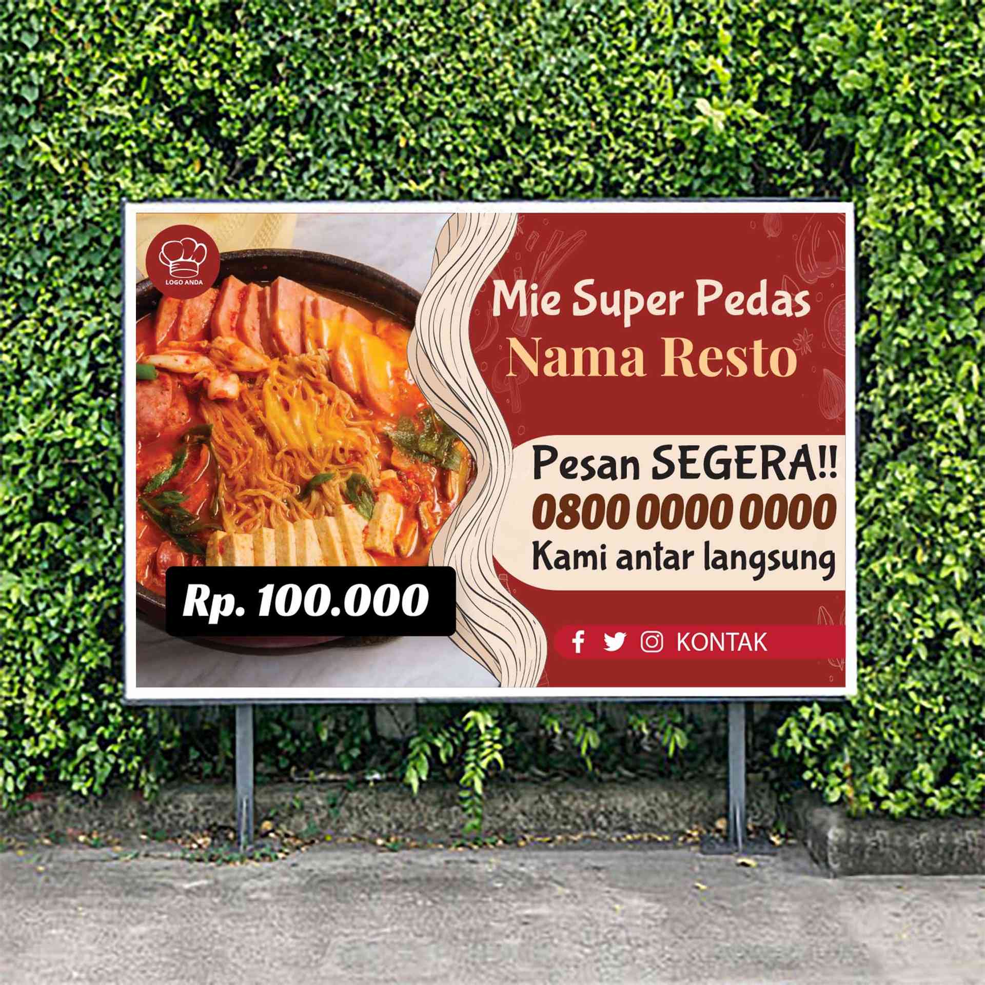 Desain banner ini mencolok dengan gambar Mie Super Pedas yang menggoda selera di sisi kiri, dilengkapi dengan teks promo yang jelas di sisi kanan. Dengan warna merah yang kuat dan kombinasi font tebal, banner ini sangat cocok dipasang di depan resto atau gerobak untuk menarik pelanggan. Teks “Pesan SEGERA!!” dan nomor telepon dibuat besar agar mudah terlihat dari kejauhan.