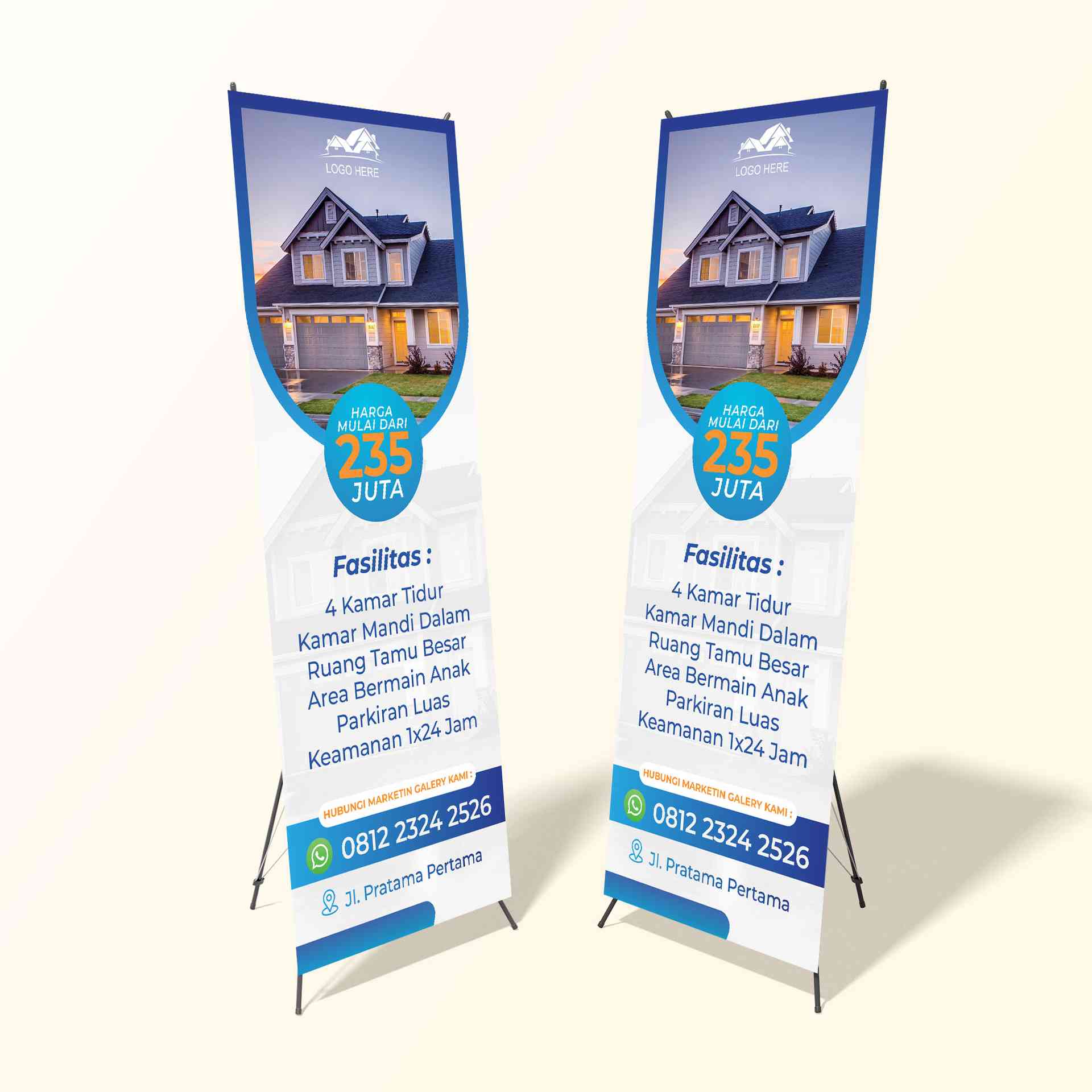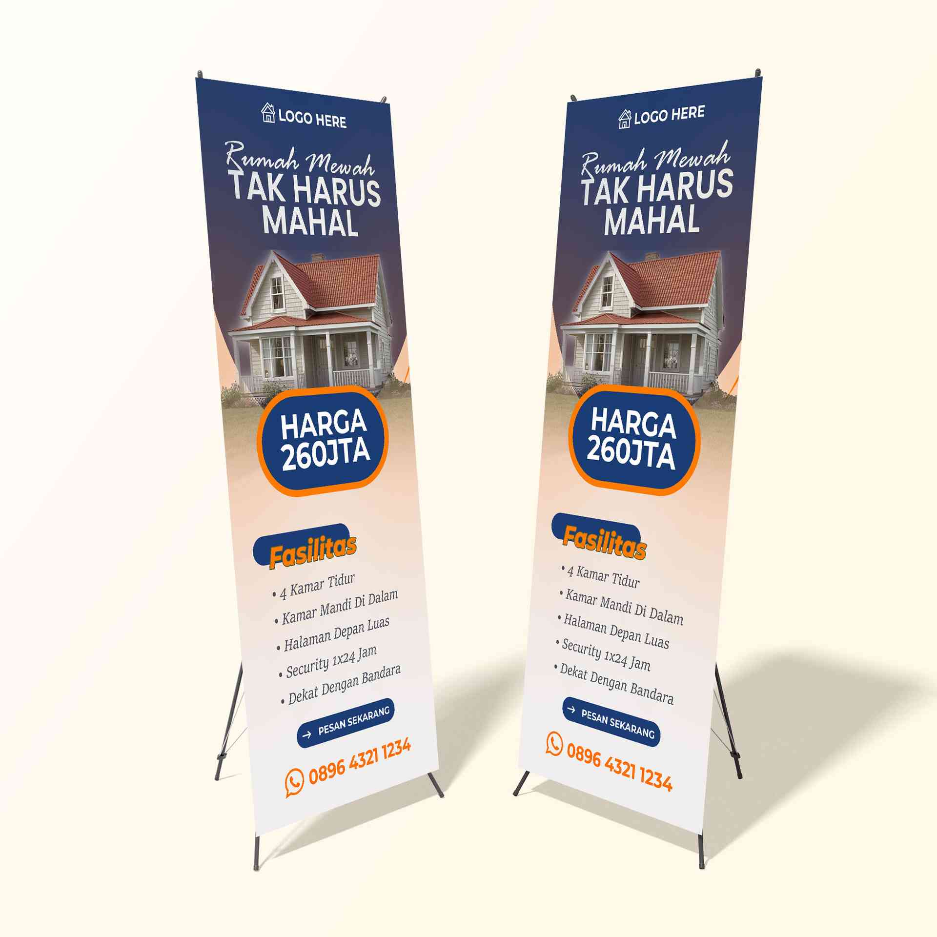Banner ini menawarkan rumah dengan harga 325 juta, memberikan gambaran jelas mengenai fasilitas rumah seperti 4 kamar tidur, kamar mandi dalam, ruang tamu besar, area bermain anak, dan parkiran luas. Desain menggunakan warna biru cerah dan profesional untuk menarik perhatian pembeli.