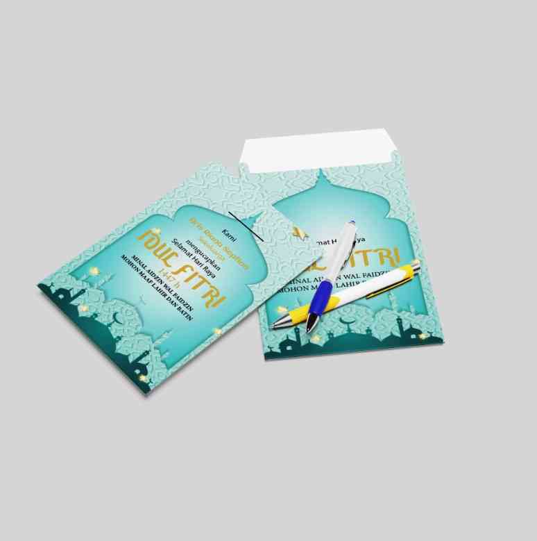 Desain kartu dan amplop ini tampil memikat dengan nuansa biru toska yang sejuk, dihiasi motif ornamen Islami yang bertekstur elegan. Bentuk lengkung d...